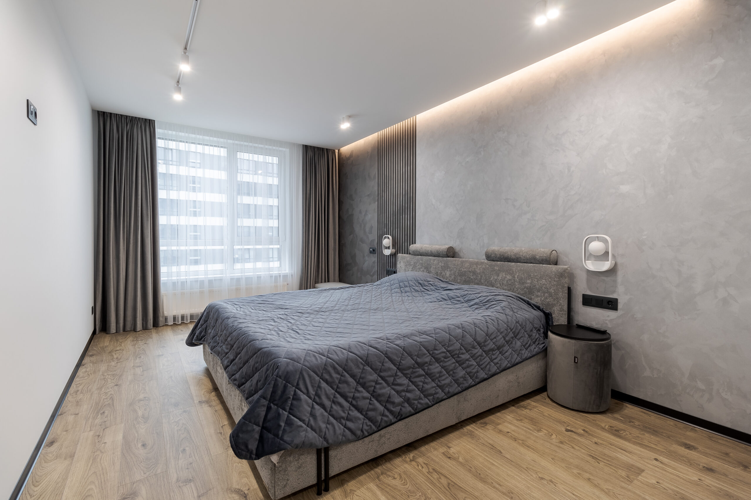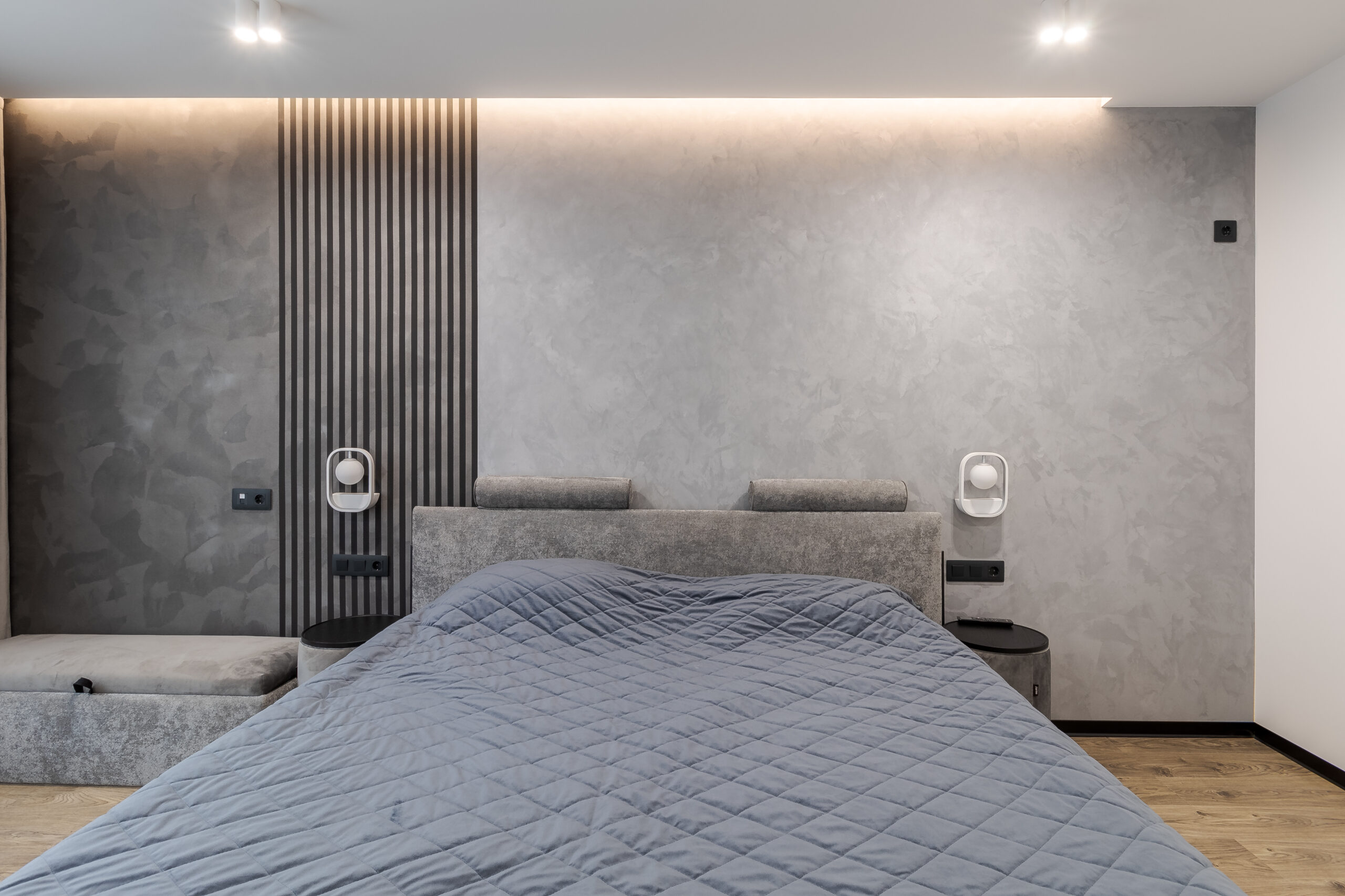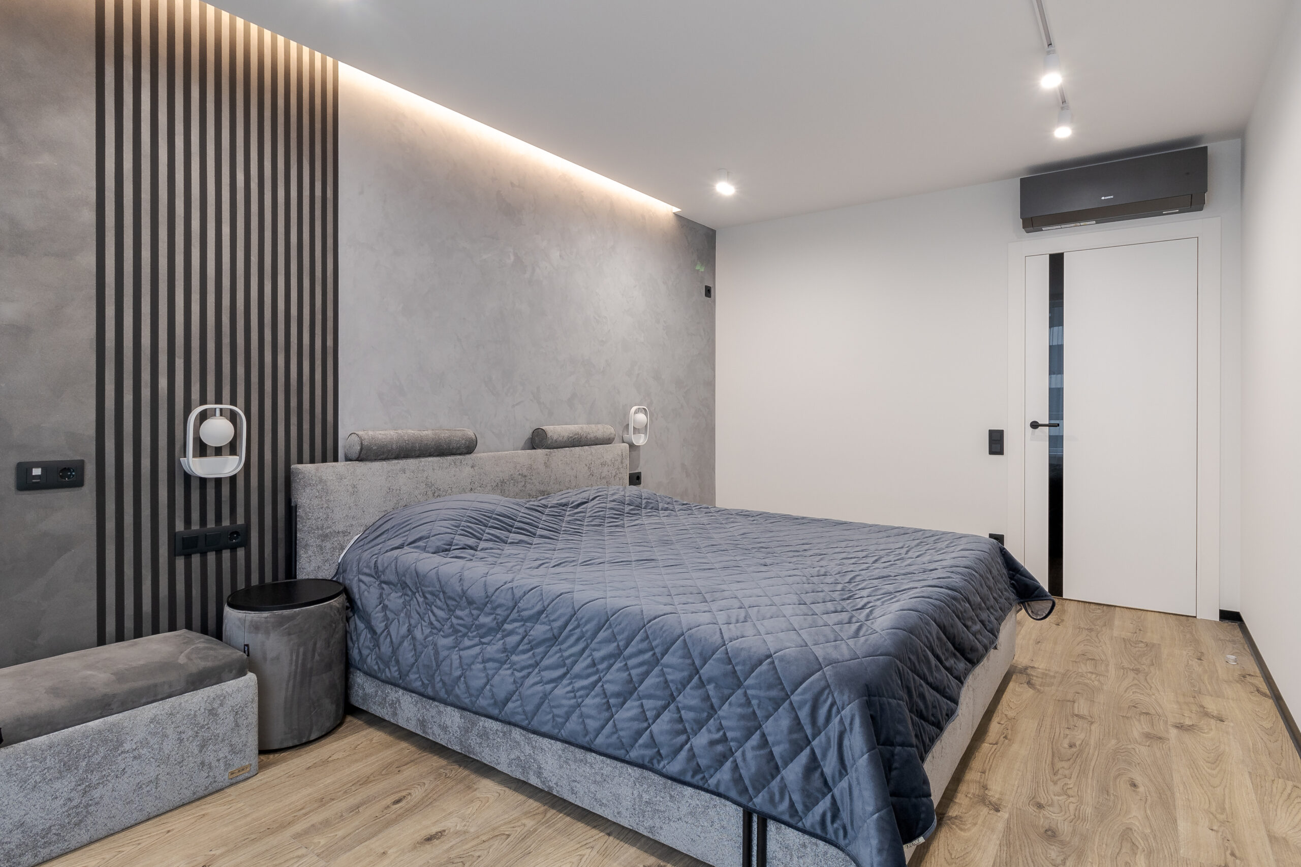 Спальня виконана в єдиній стилістиці з текстурованими стінами та рейковими панелями. Настінні світильники інтегровані у панелі, прикроватні м’які тумби чорного кольору підтримують графічність інтер’єру.
