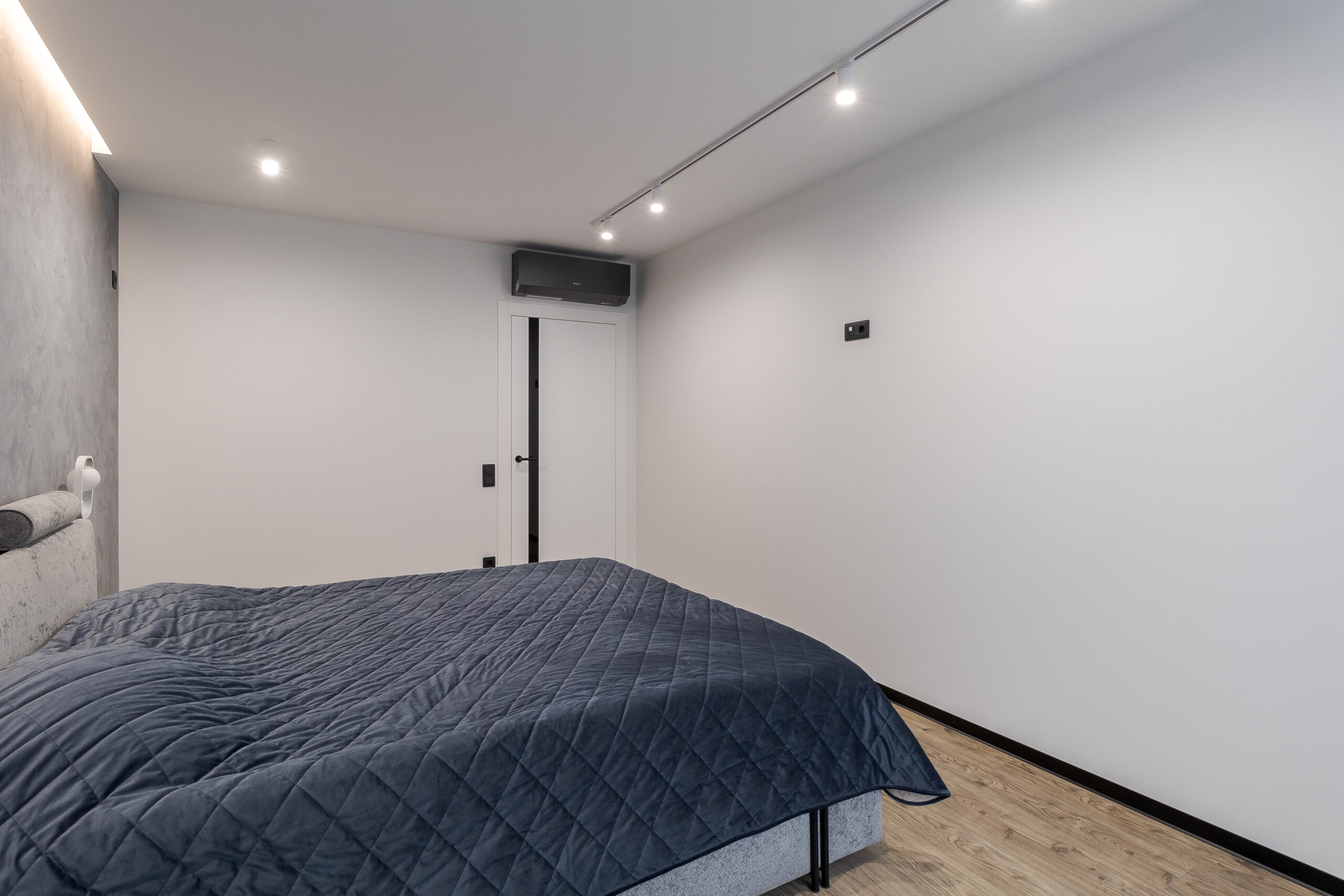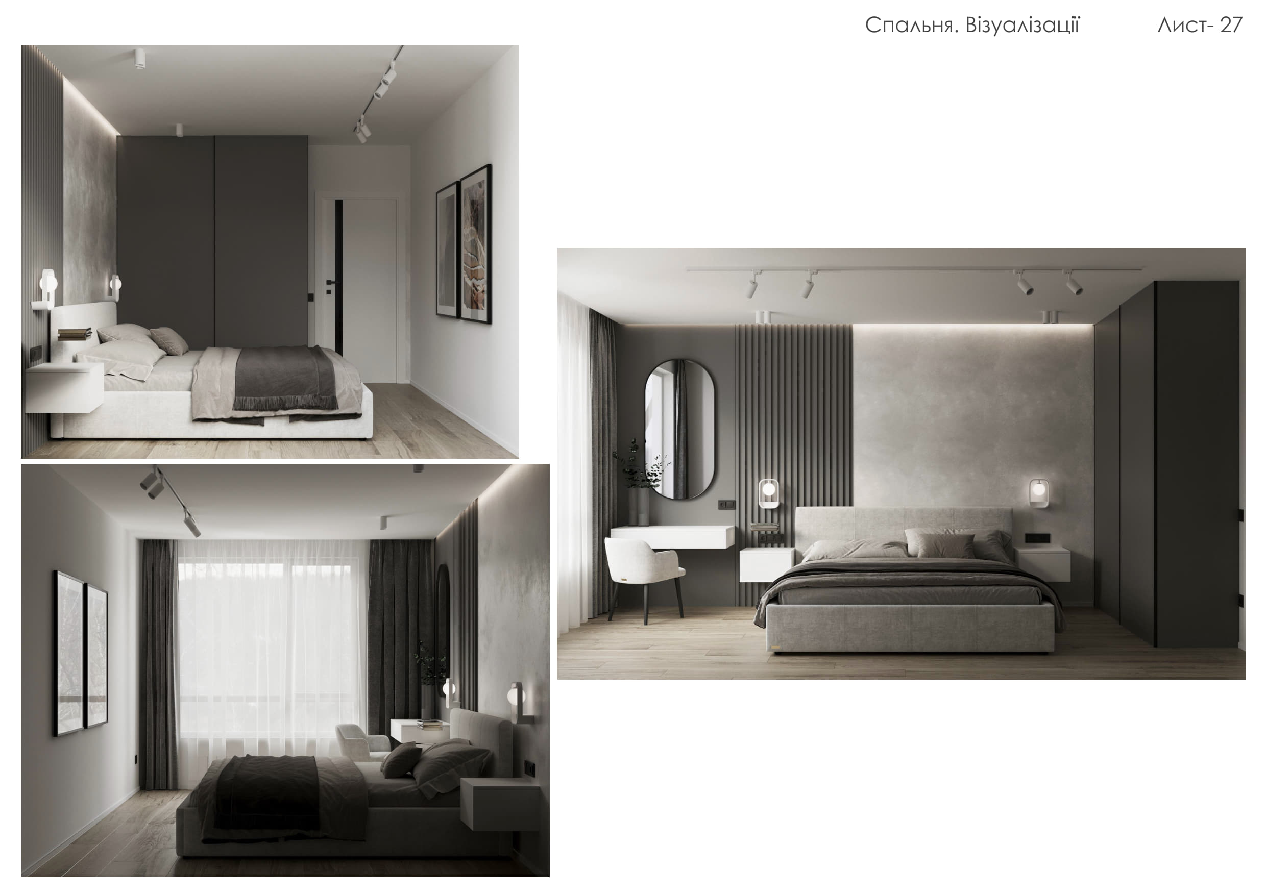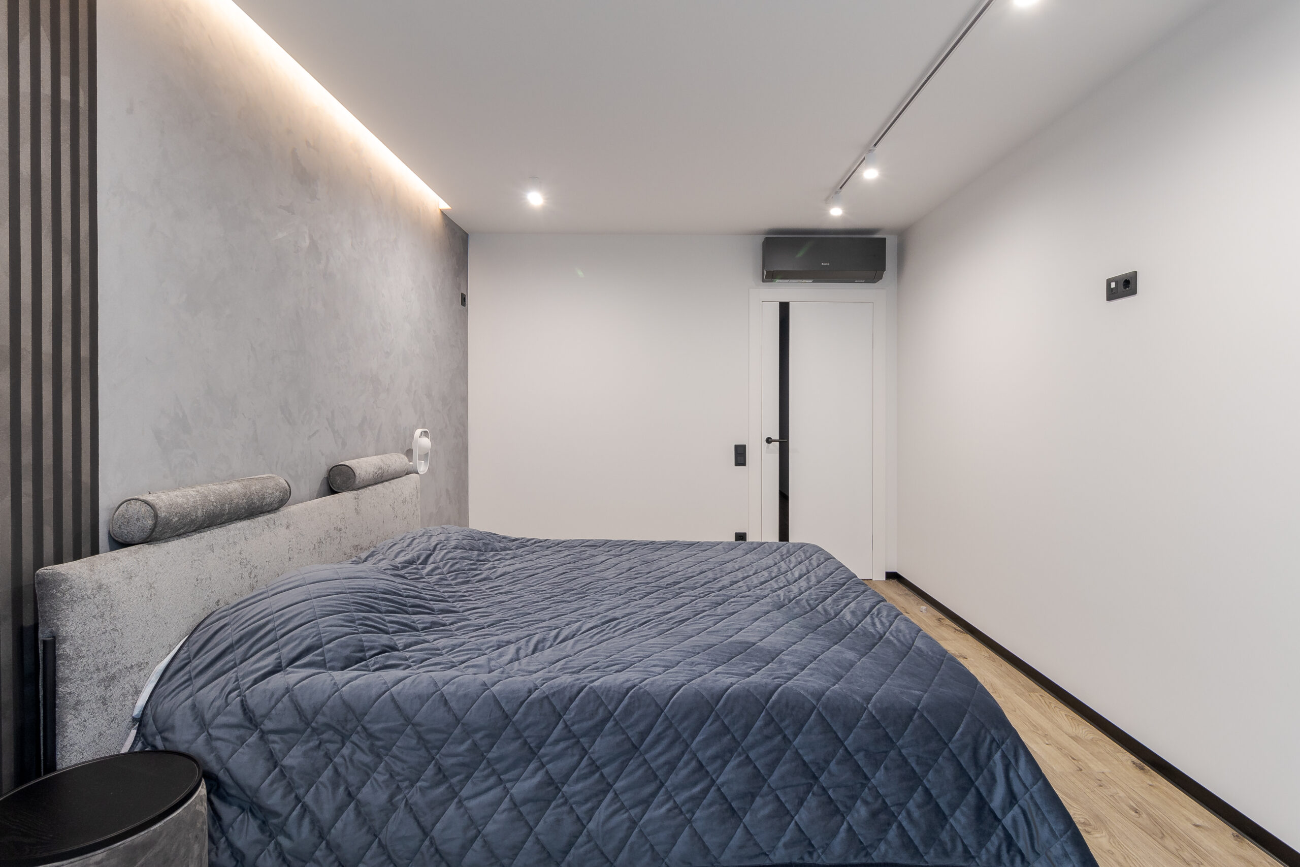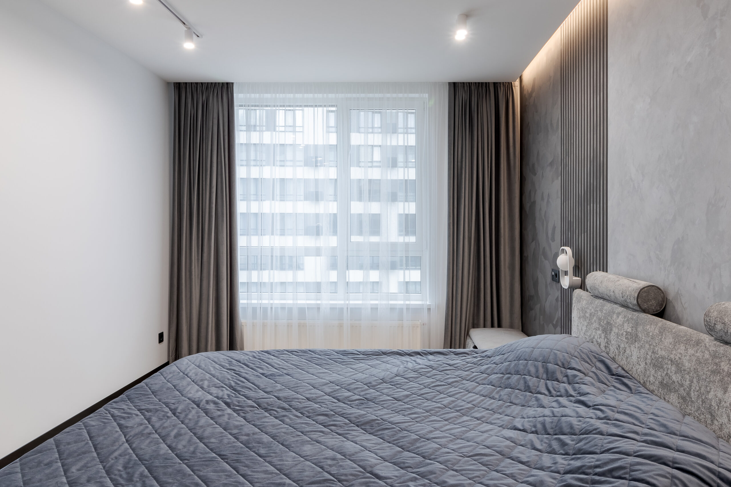Спальня виконана в єдиній стилістиці з текстурованими стінами та рейковими панелями. Настінні світильники інтегровані у панелі, прикроватні м’які тумби чорного кольору підтримують графічність інтер’єру.