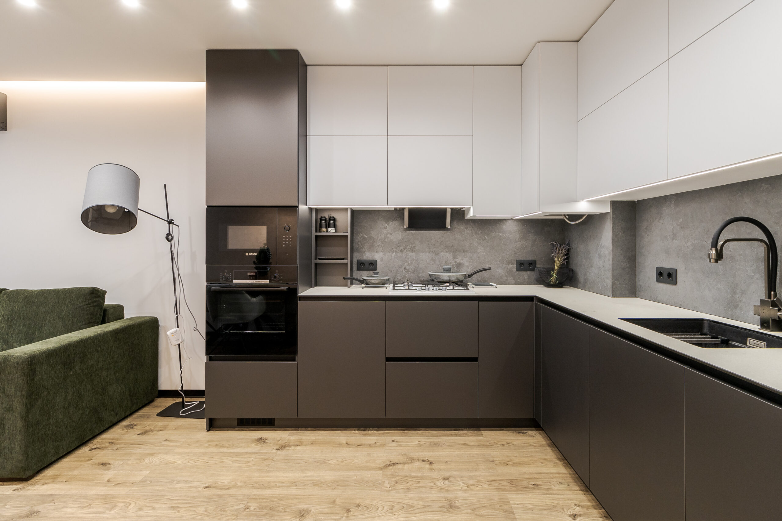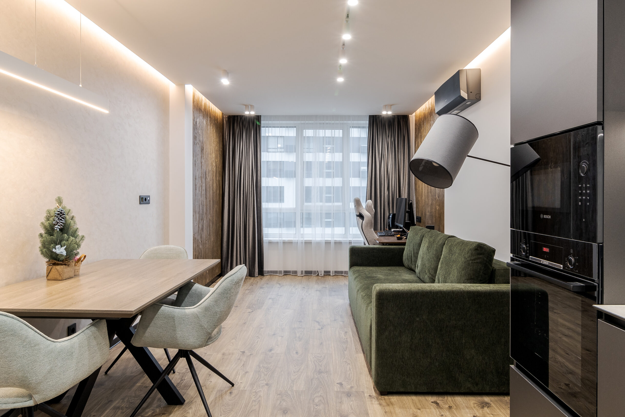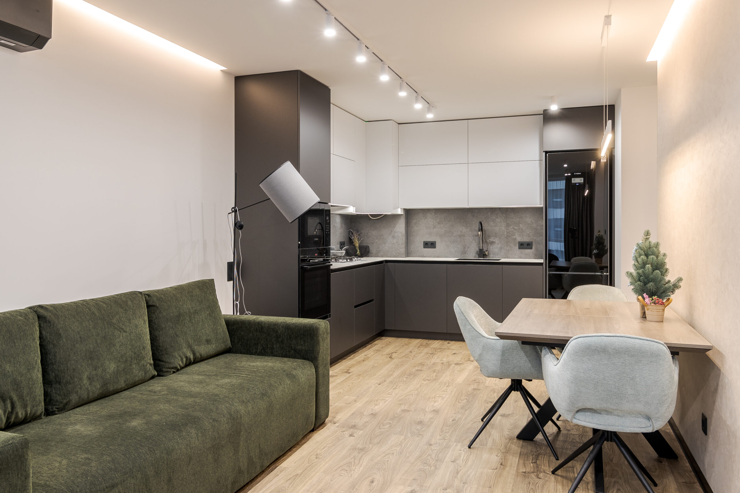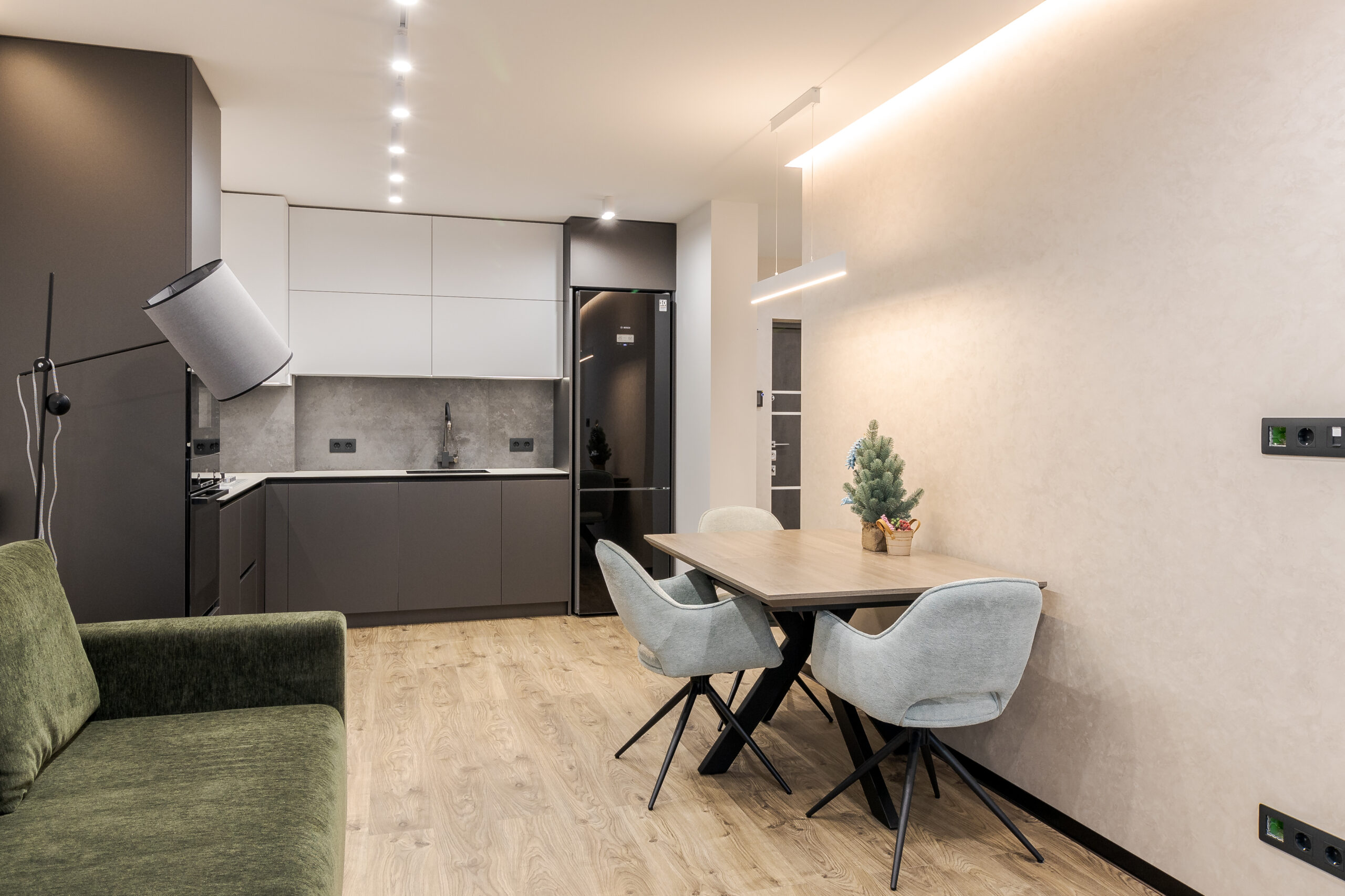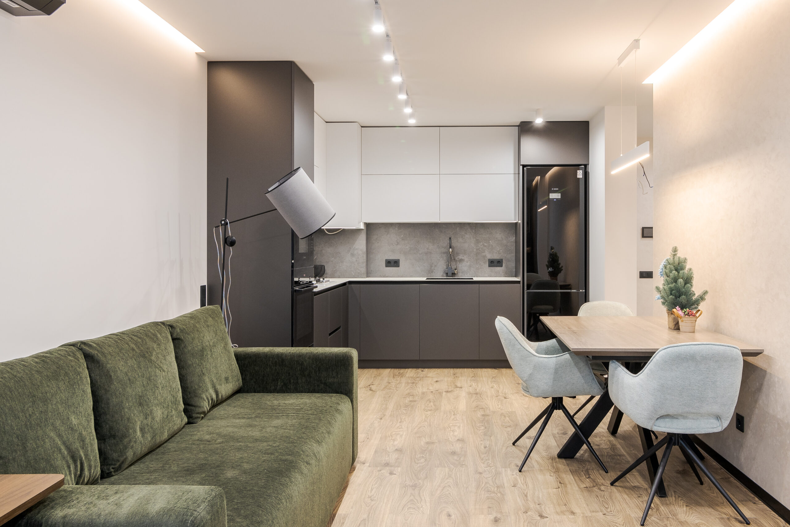 Кухня виконана з фасадами двох кольорів: верхні шафи білі матові, нижні сірого кольору. Вбудовано сучасну техніку Bosch. Центральним елементом вітальні став зелений оксамитовий диван, обідня зона укомплектована столом з дерева.