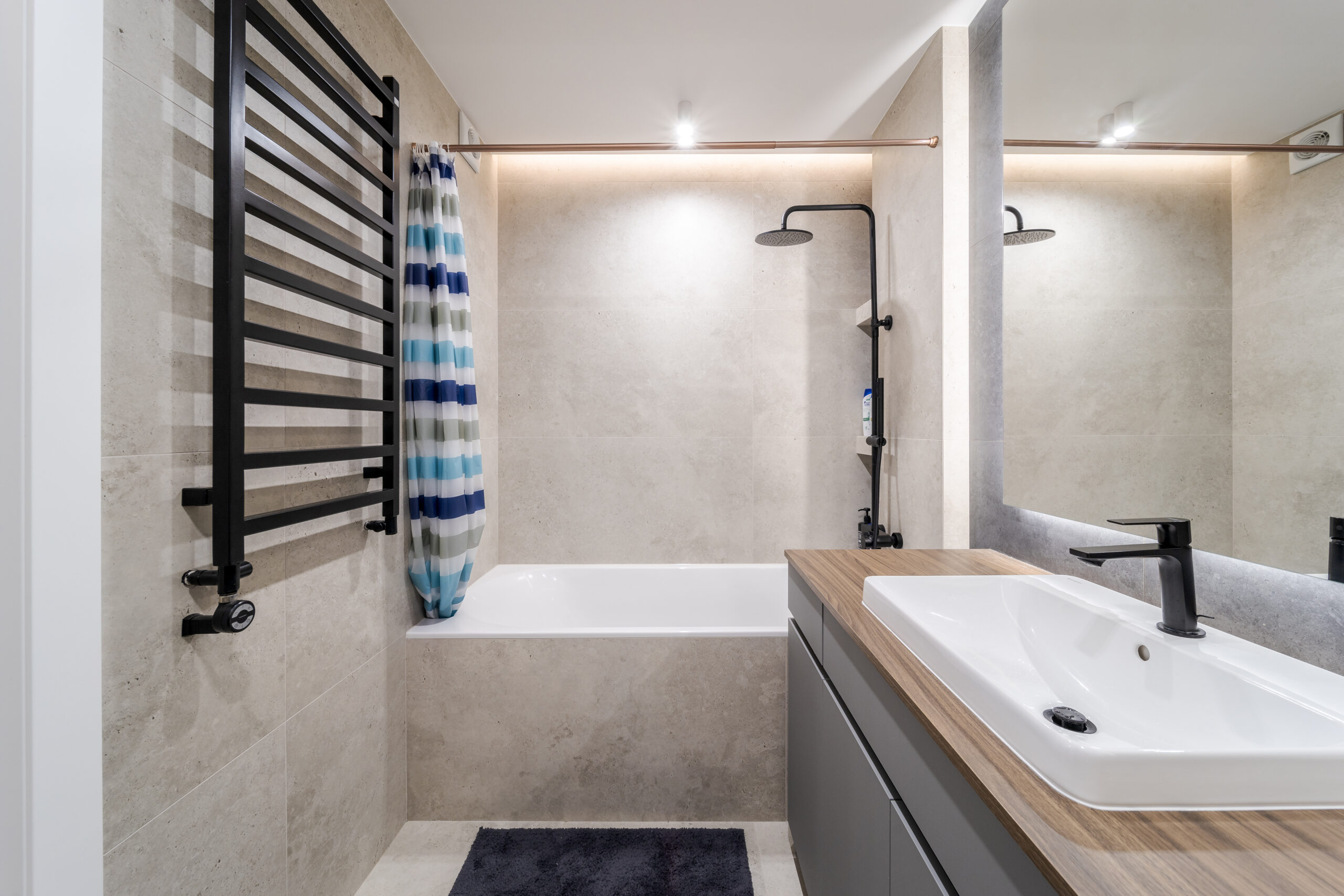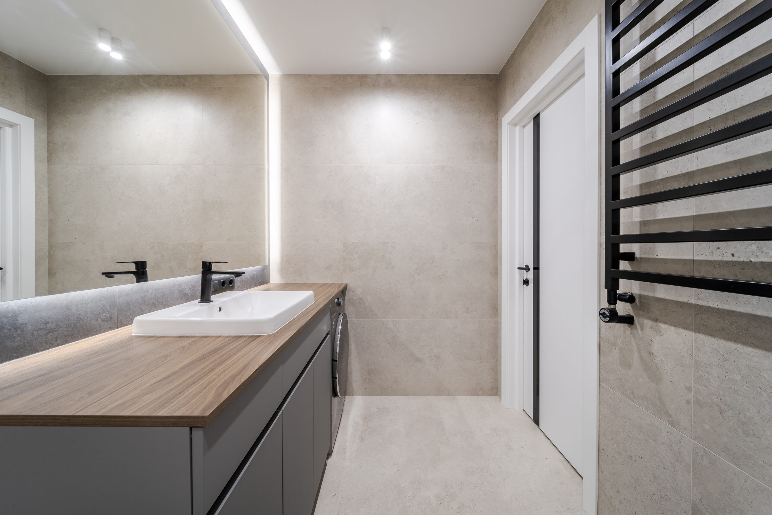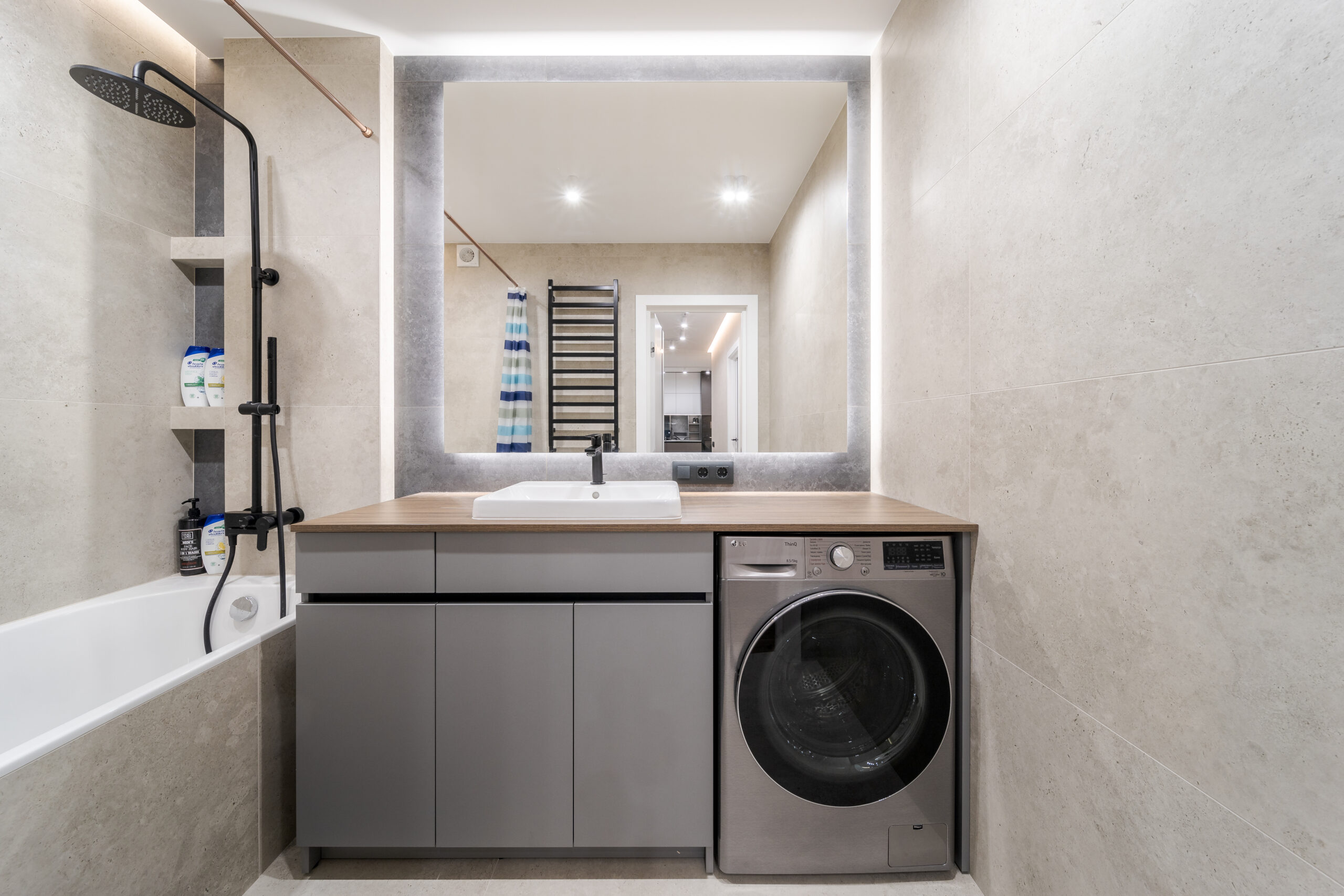 У санвузлі використано комбінацію світлої та темно-сірої плитки, чорну підвісну сантехніку.В основній ванній пральна машина розміщена під стільницею, велике дзеркало з LED-підсвіткою візуально розширює простір.