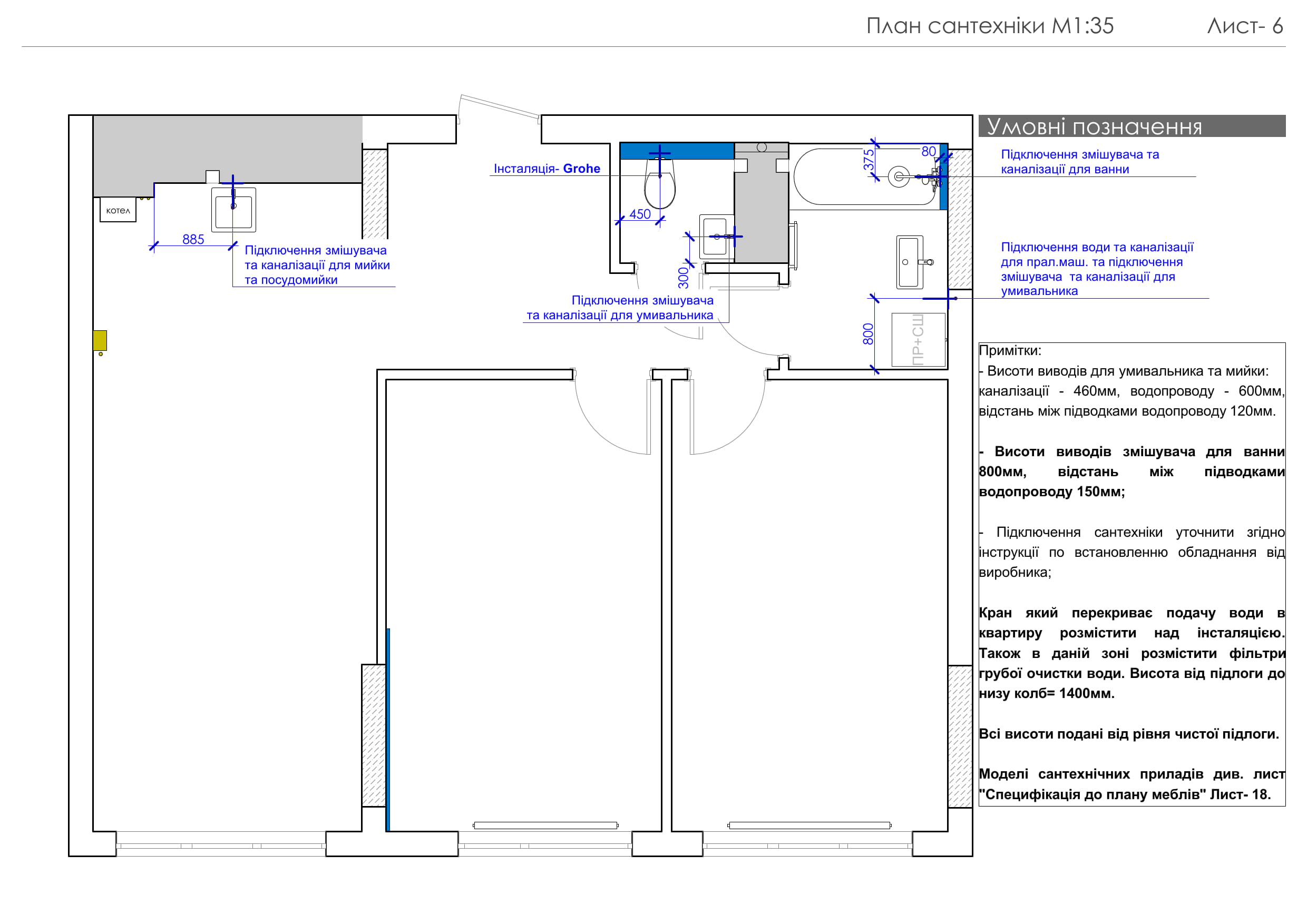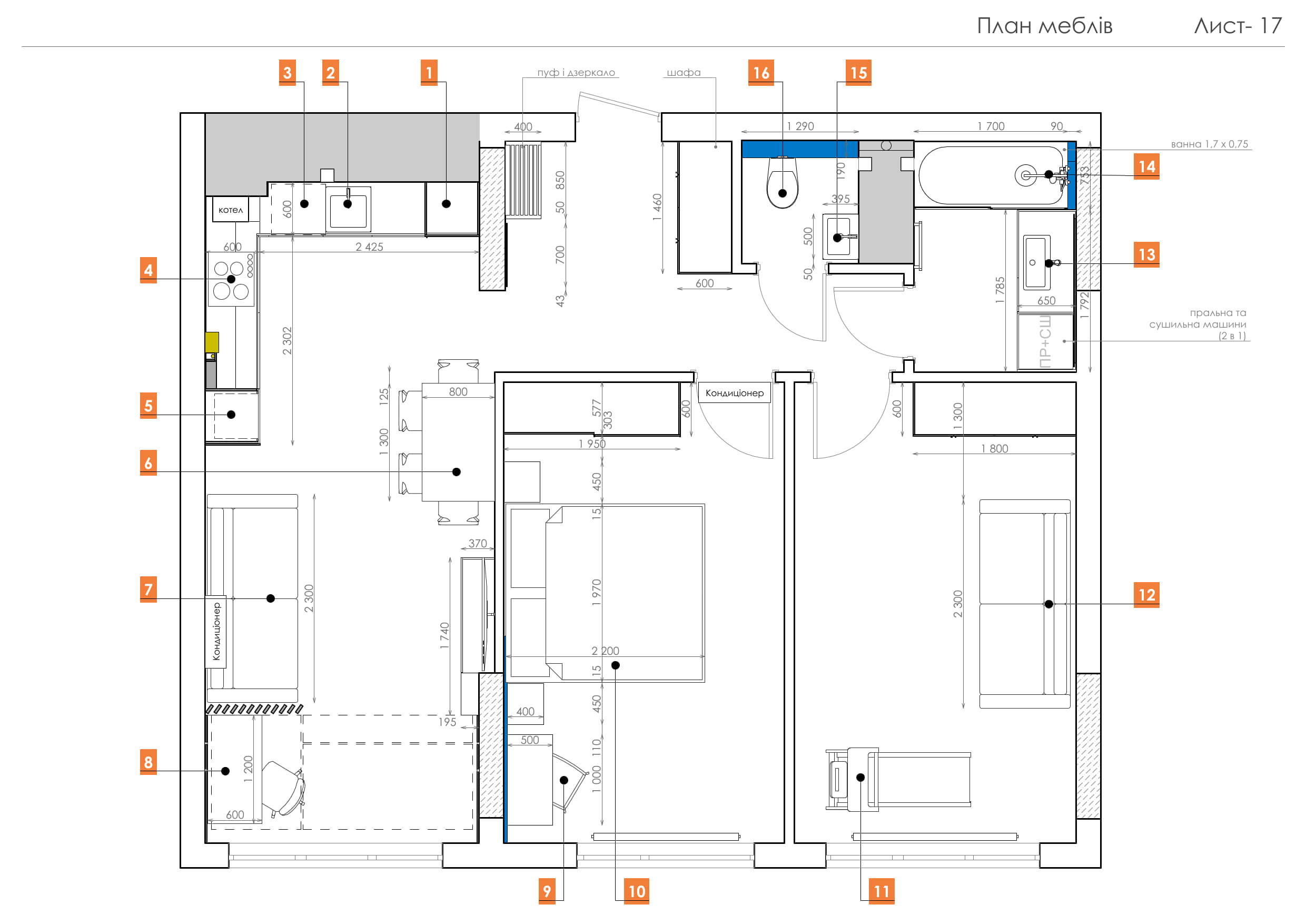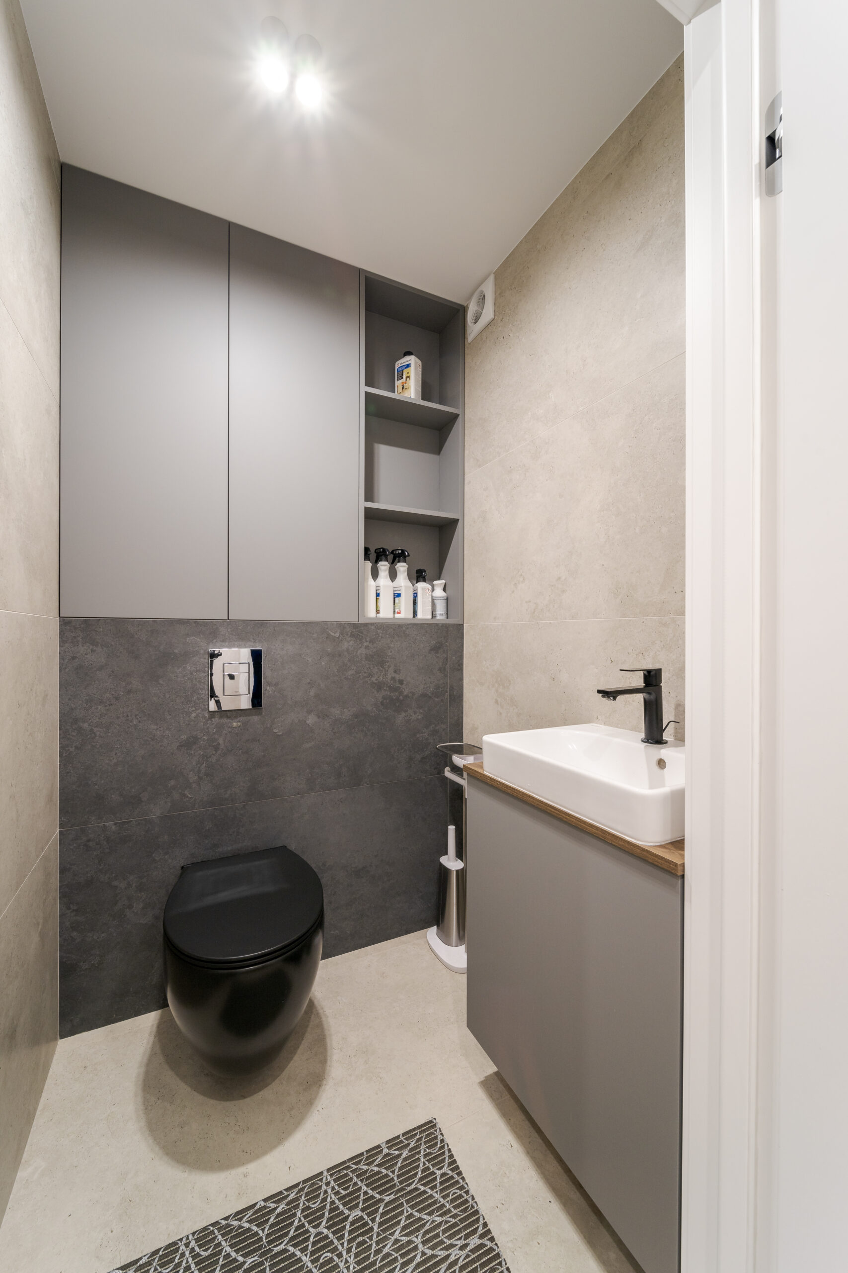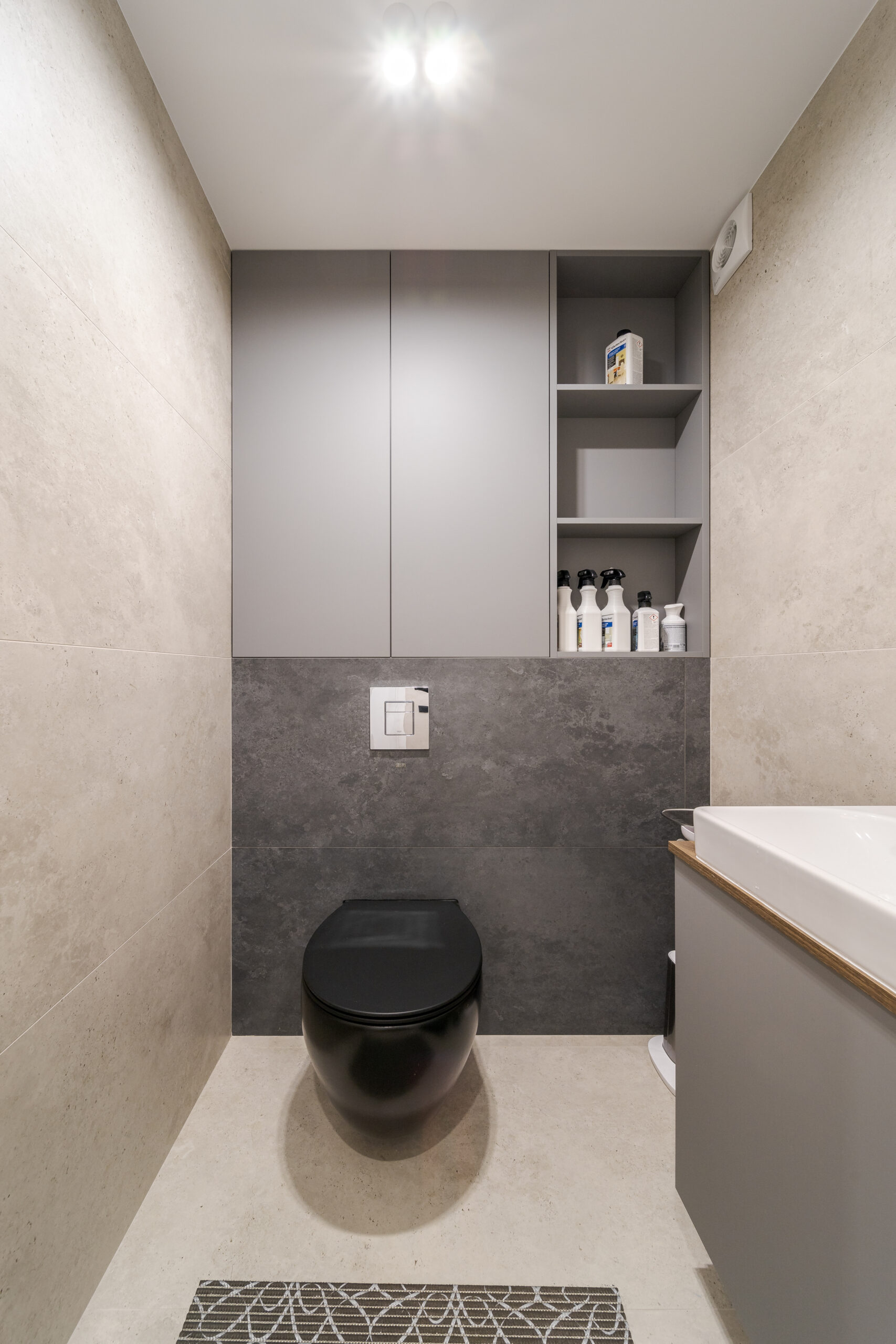 У санвузлі використано комбінацію світлої та темно-сірої плитки, чорну підвісну сантехніку.В основній ванній пральна машина розміщена під стільницею, велике дзеркало з LED-підсвіткою візуально розширює простір.