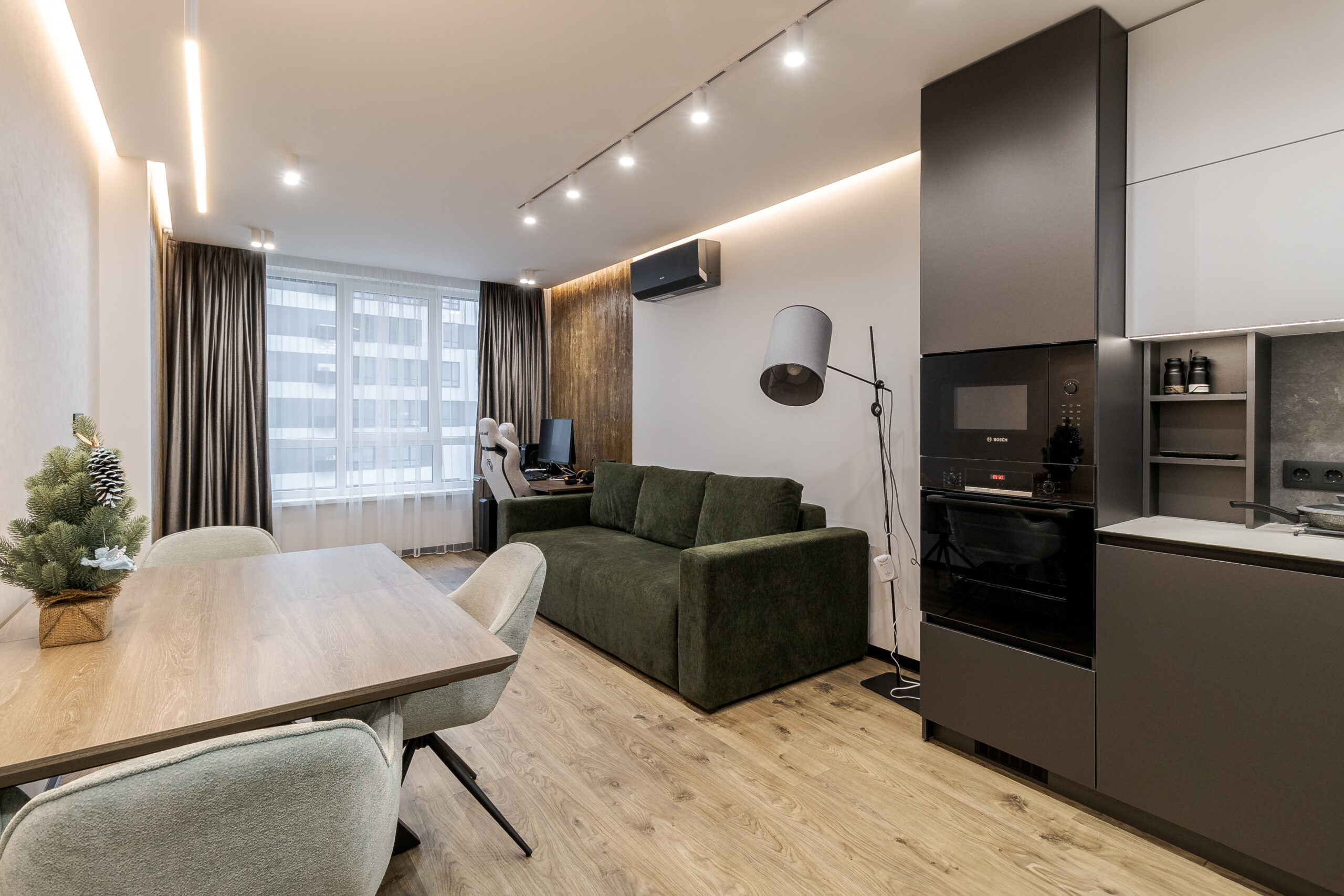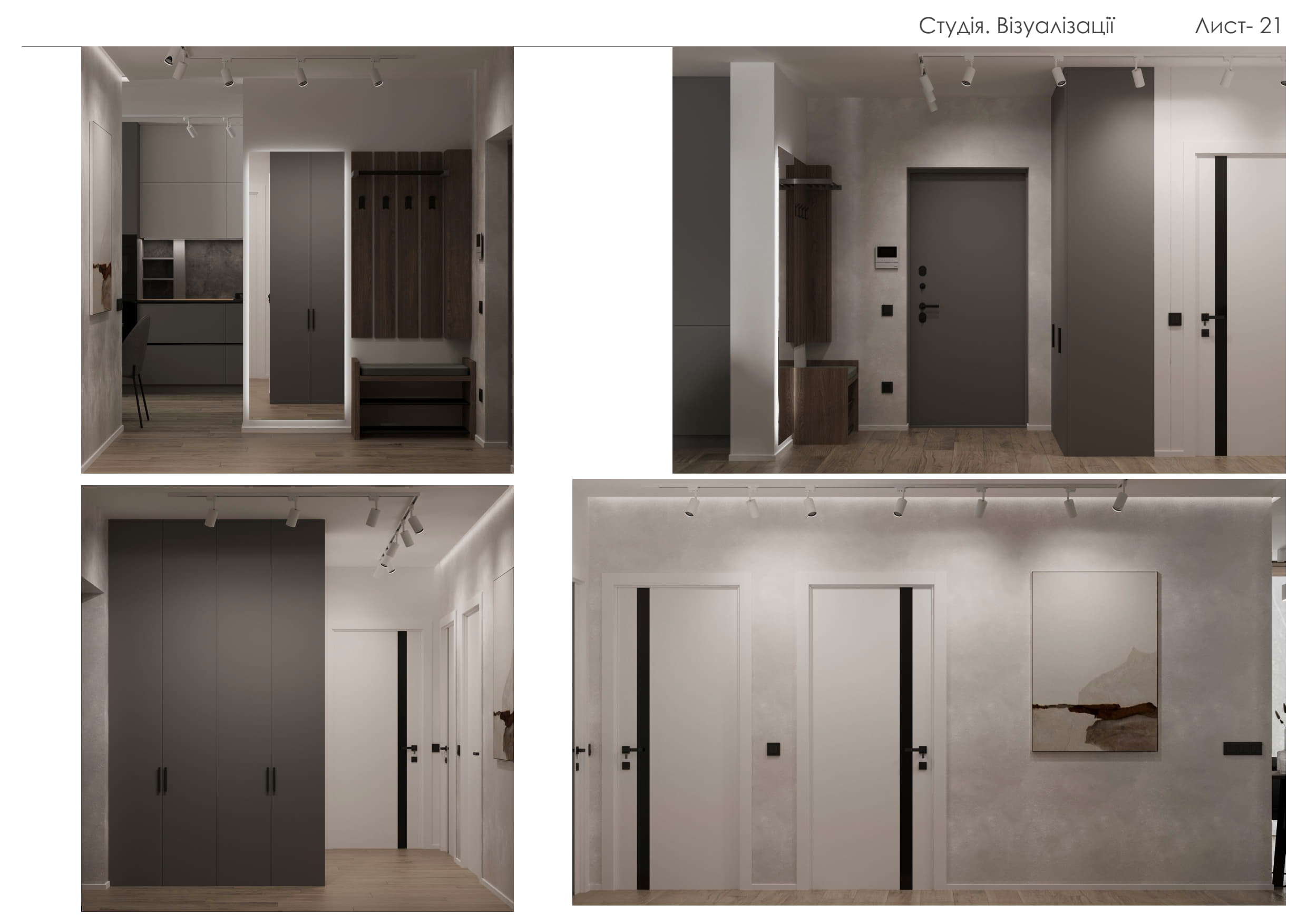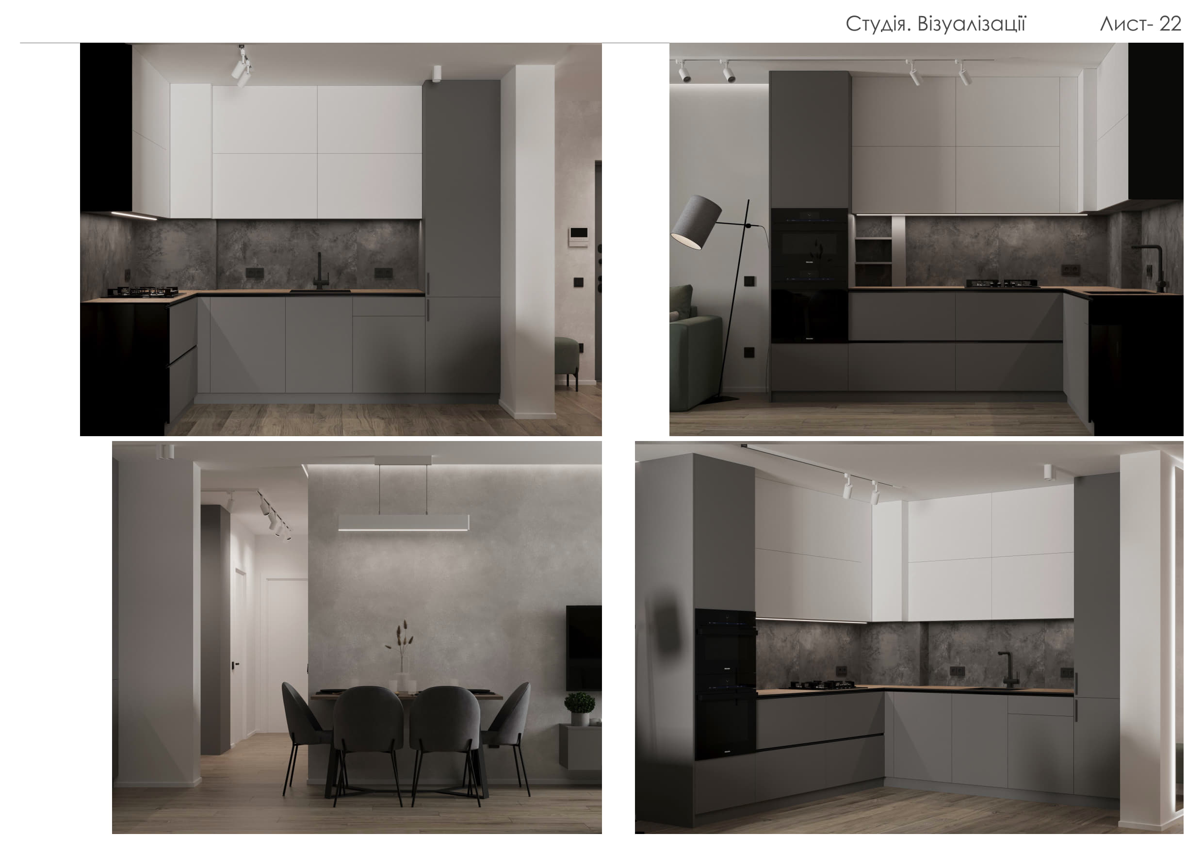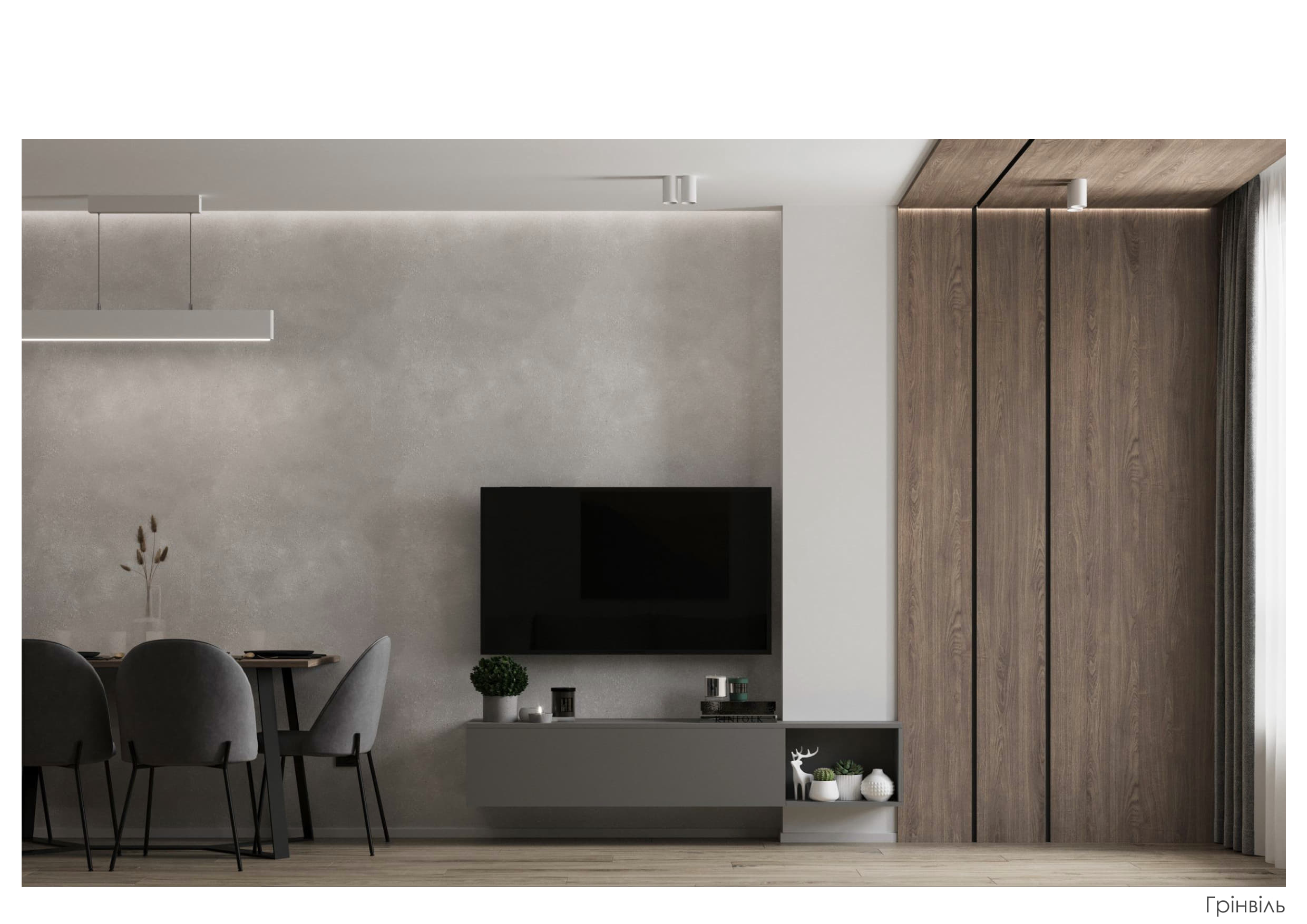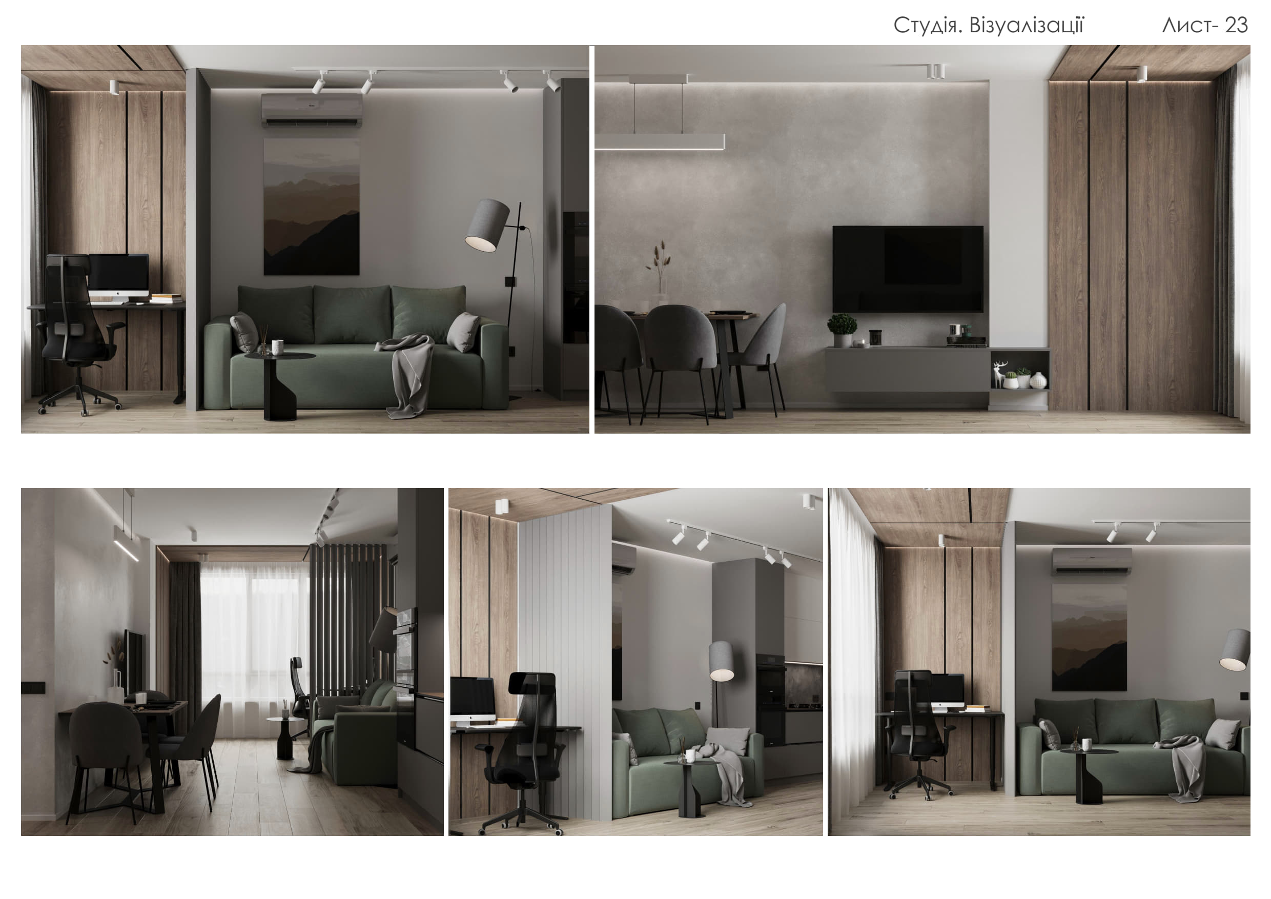 Цей проєкт демонструє створення сучасного функціонального простору, що поєднує елегантність, практичність та затишок. Концепція будується на природних текстурах та стриманій кольоровій палітрі: відтінки сірого, білого та натурального дерева доповнені чорними деталями та акцентним зеленим кольором м’яких меблів.