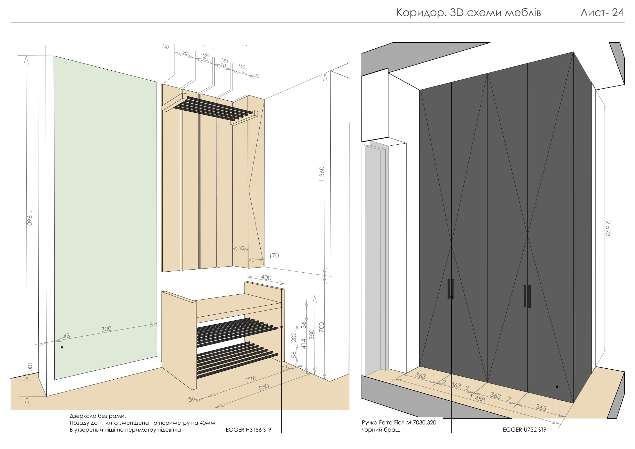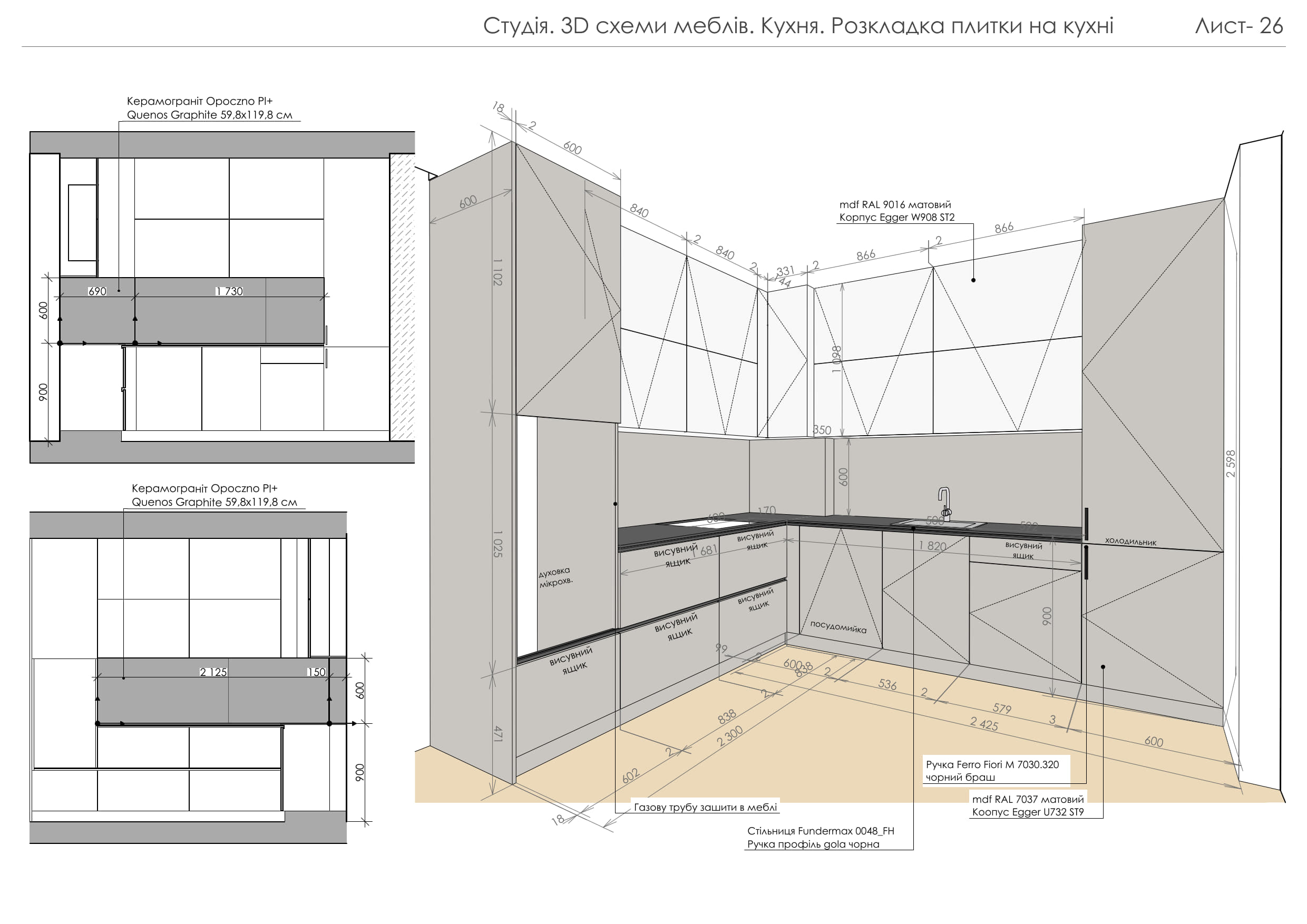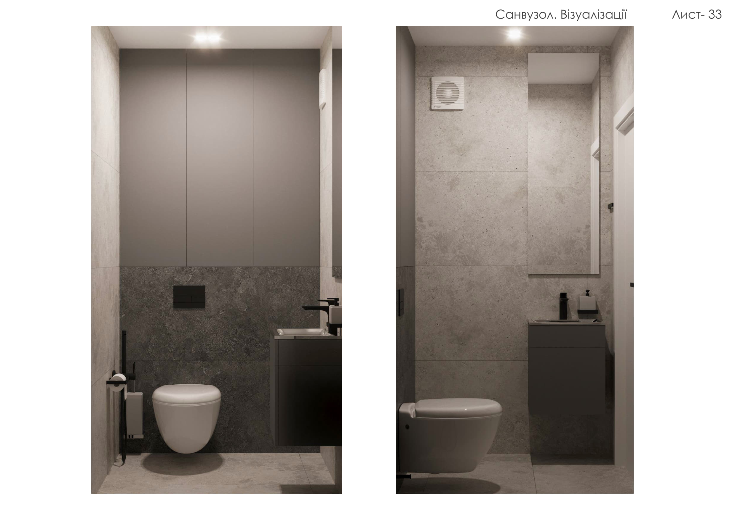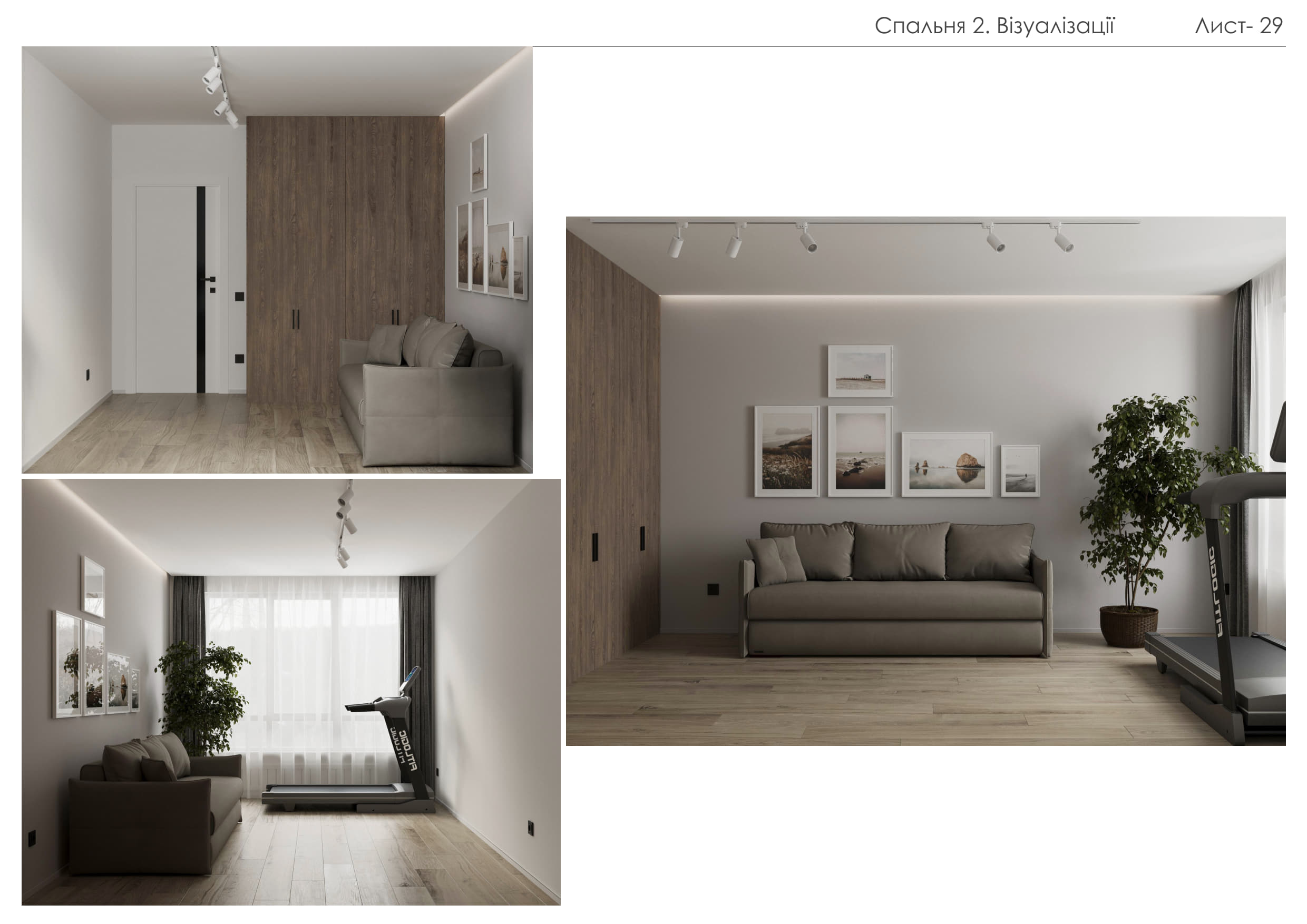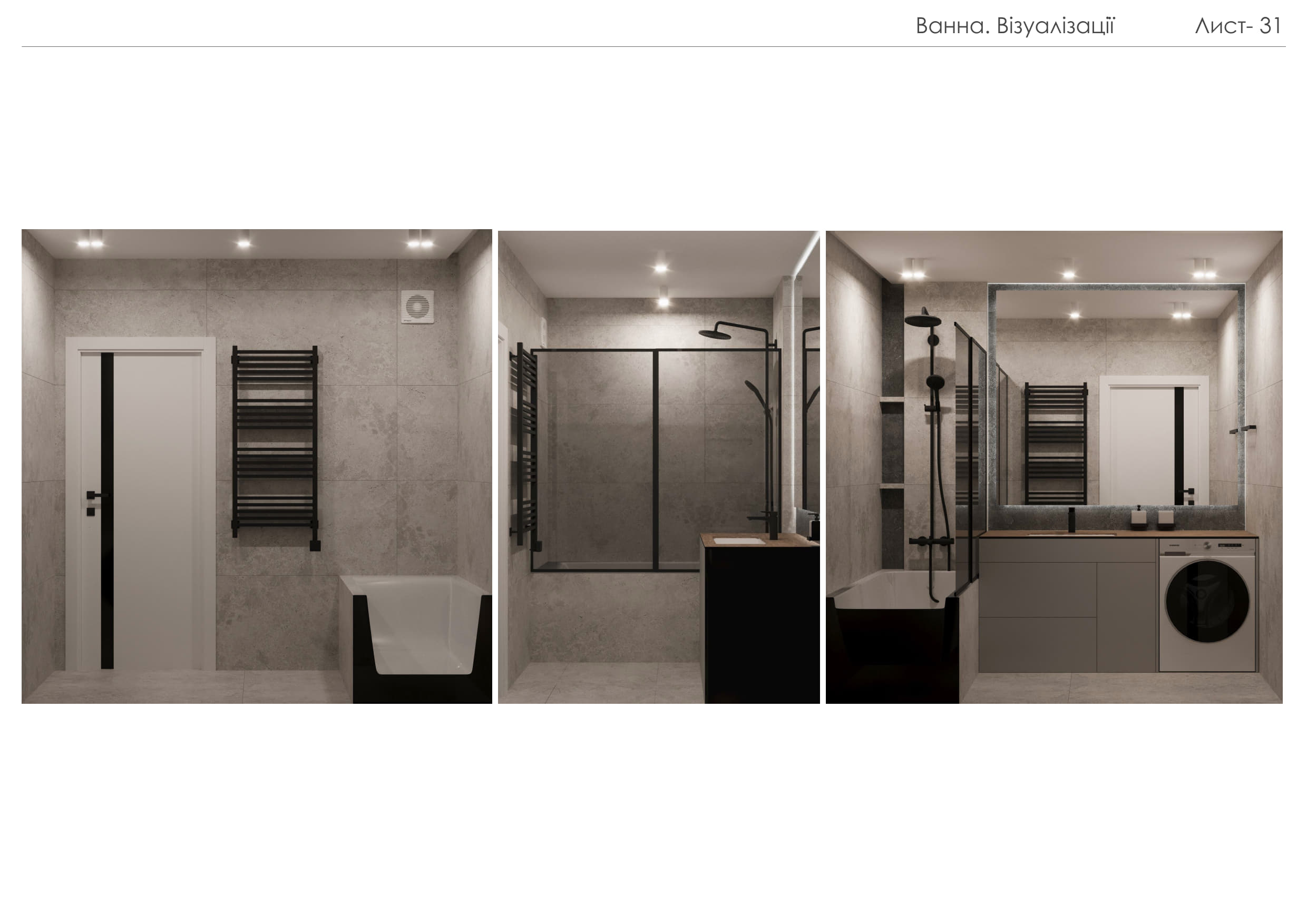 Цей проєкт демонструє створення сучасного функціонального простору, що поєднує елегантність, практичність та затишок. Концепція будується на природних текстурах та стриманій кольоровій палітрі: відтінки сірого, білого та натурального дерева доповнені чорними деталями та акцентним зеленим кольором м’яких меблів.