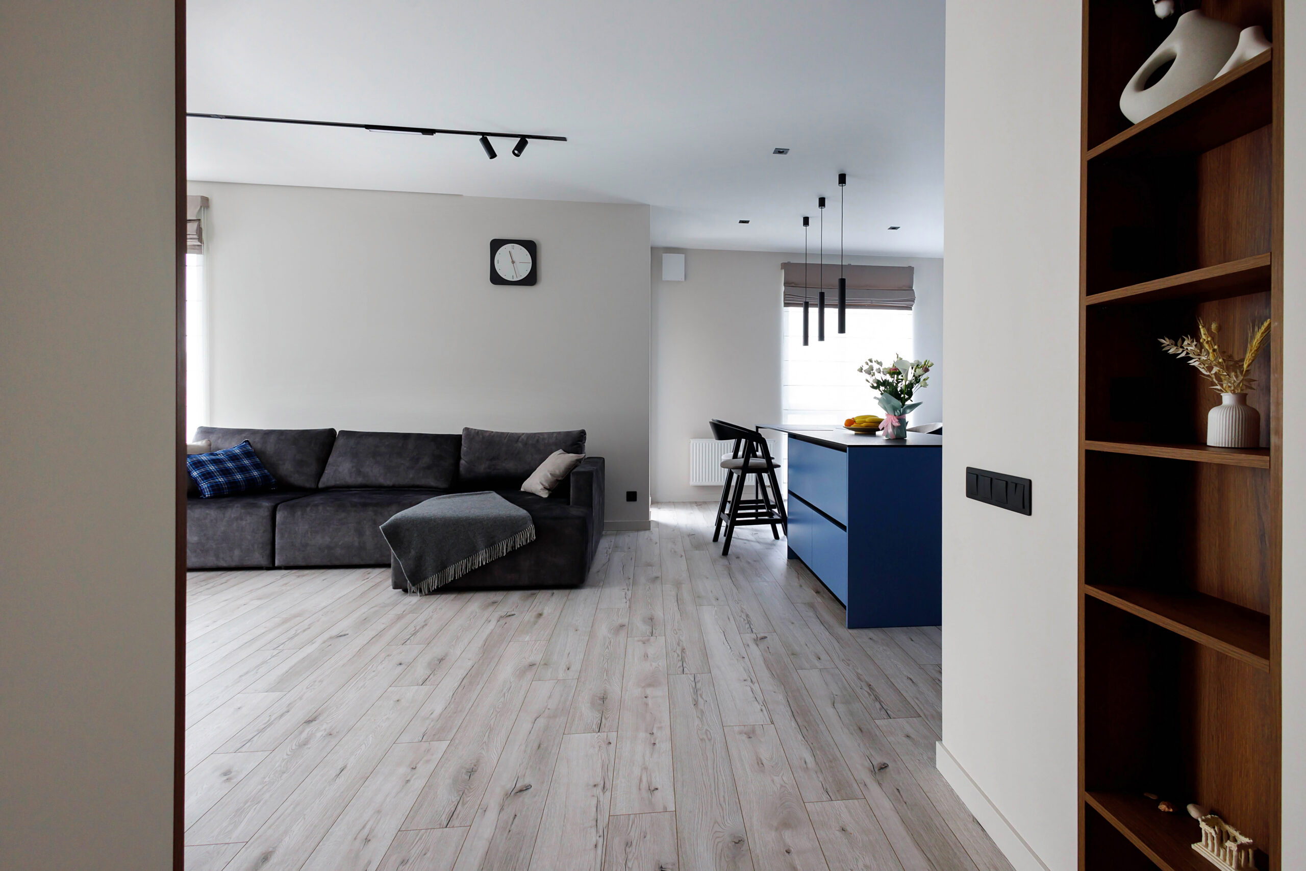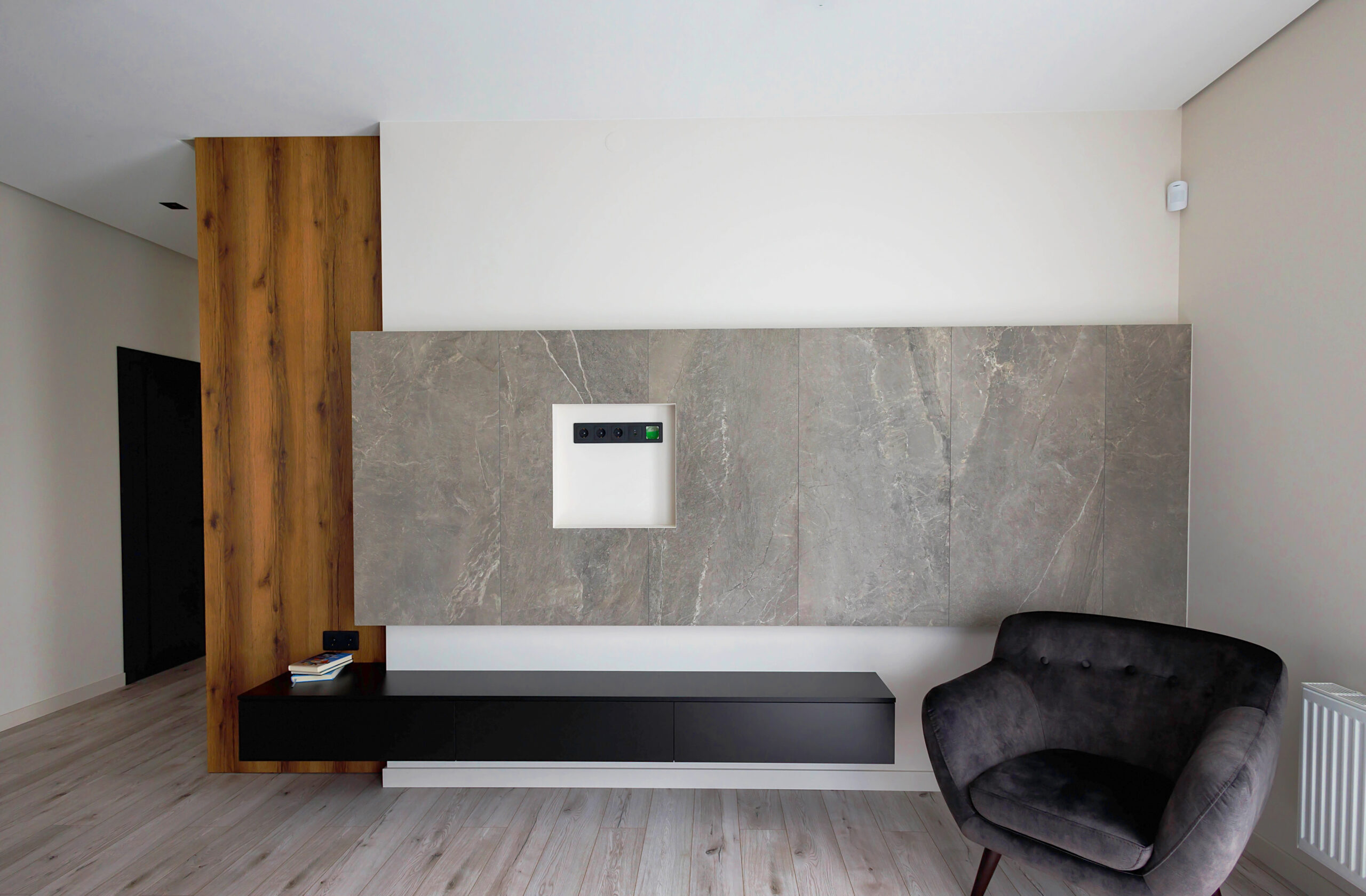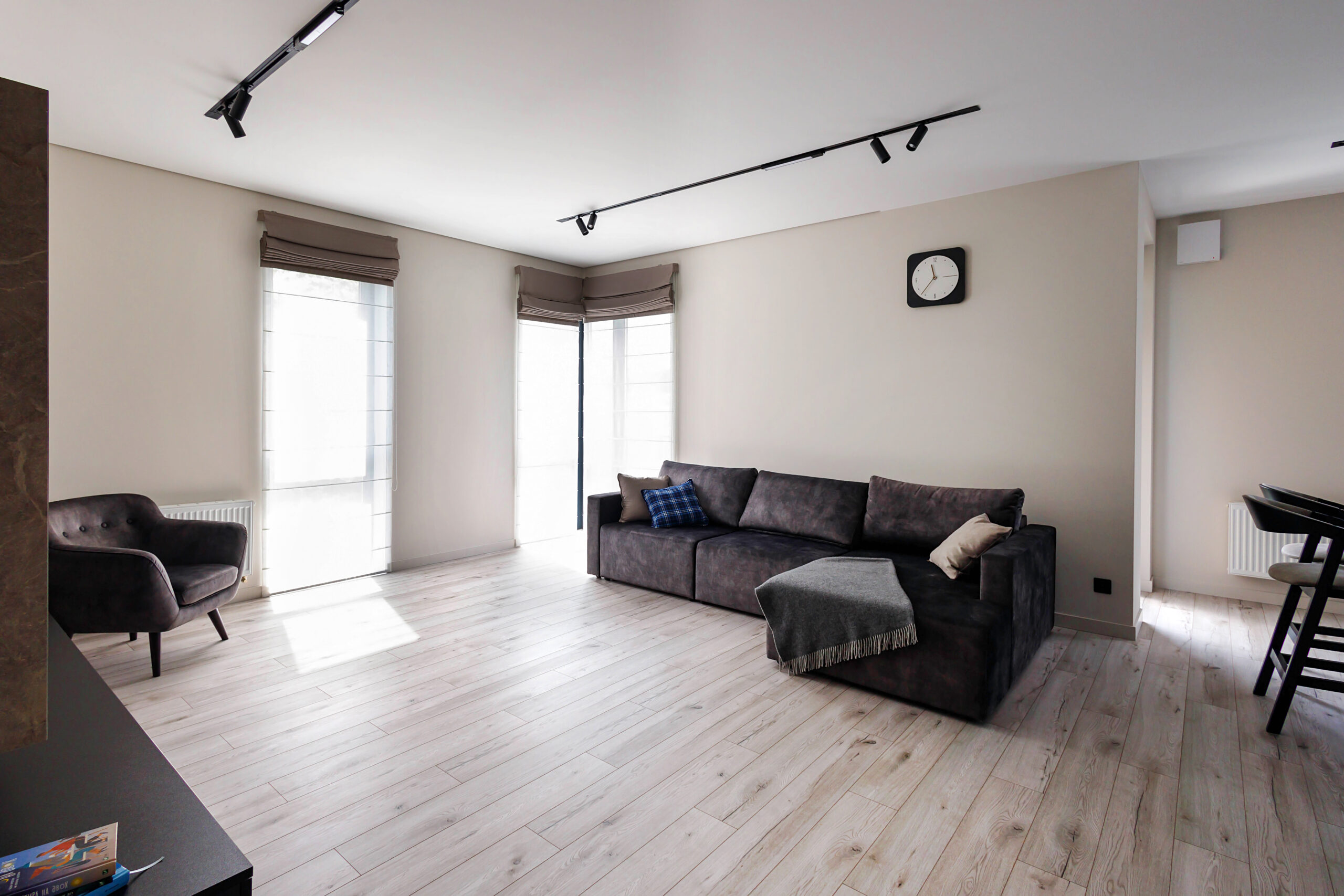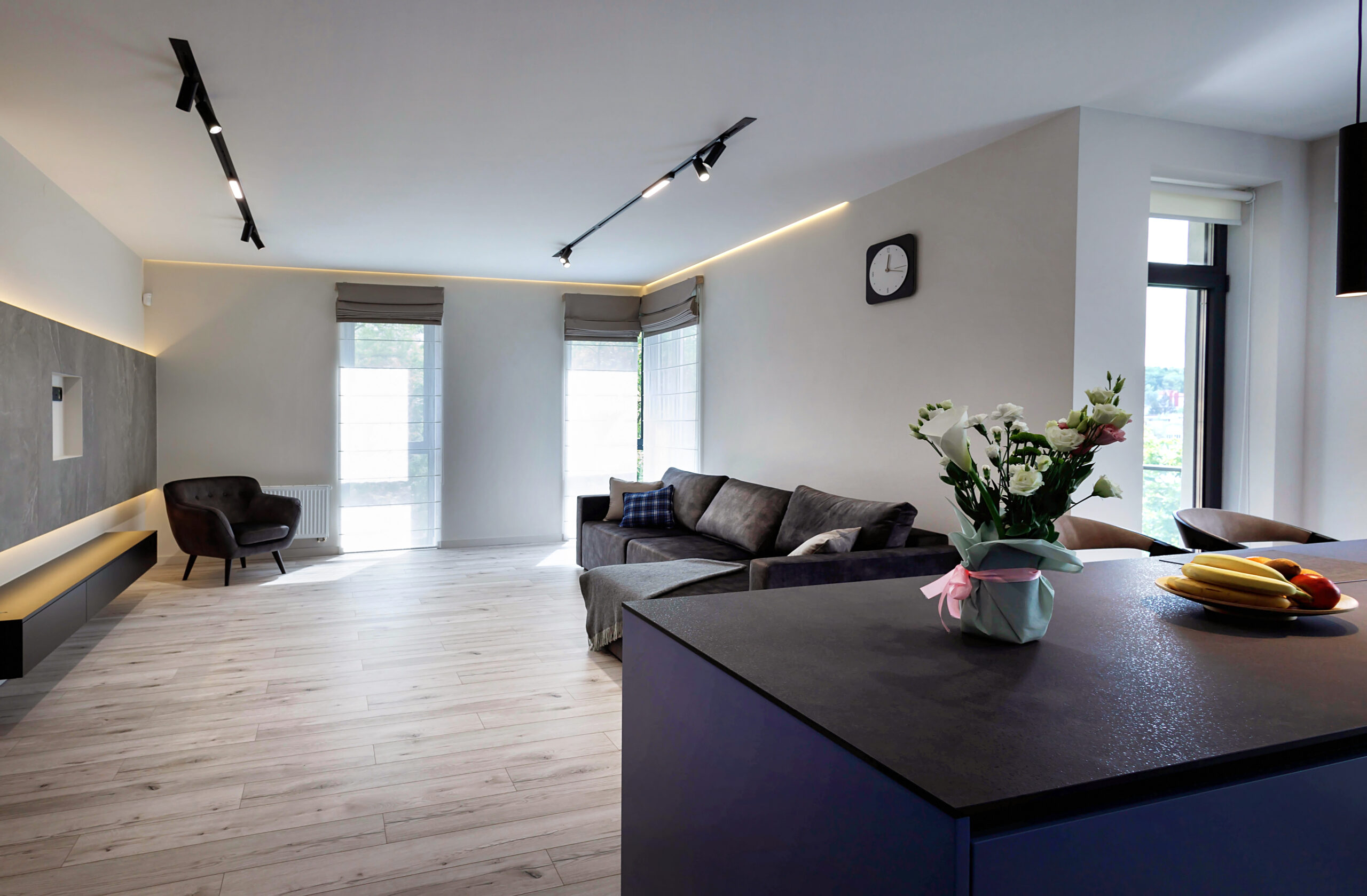 Вітальня є серцем квартири завдяки відкритому плануванню та великим вікнам. Застосовано комбінацію світлих стін із темними декоративними панелями, а лінійні LED-профілі підкреслюють архітектуру стелі. М’які меблі в нейтральних тонах створюють атмосферу затишку.