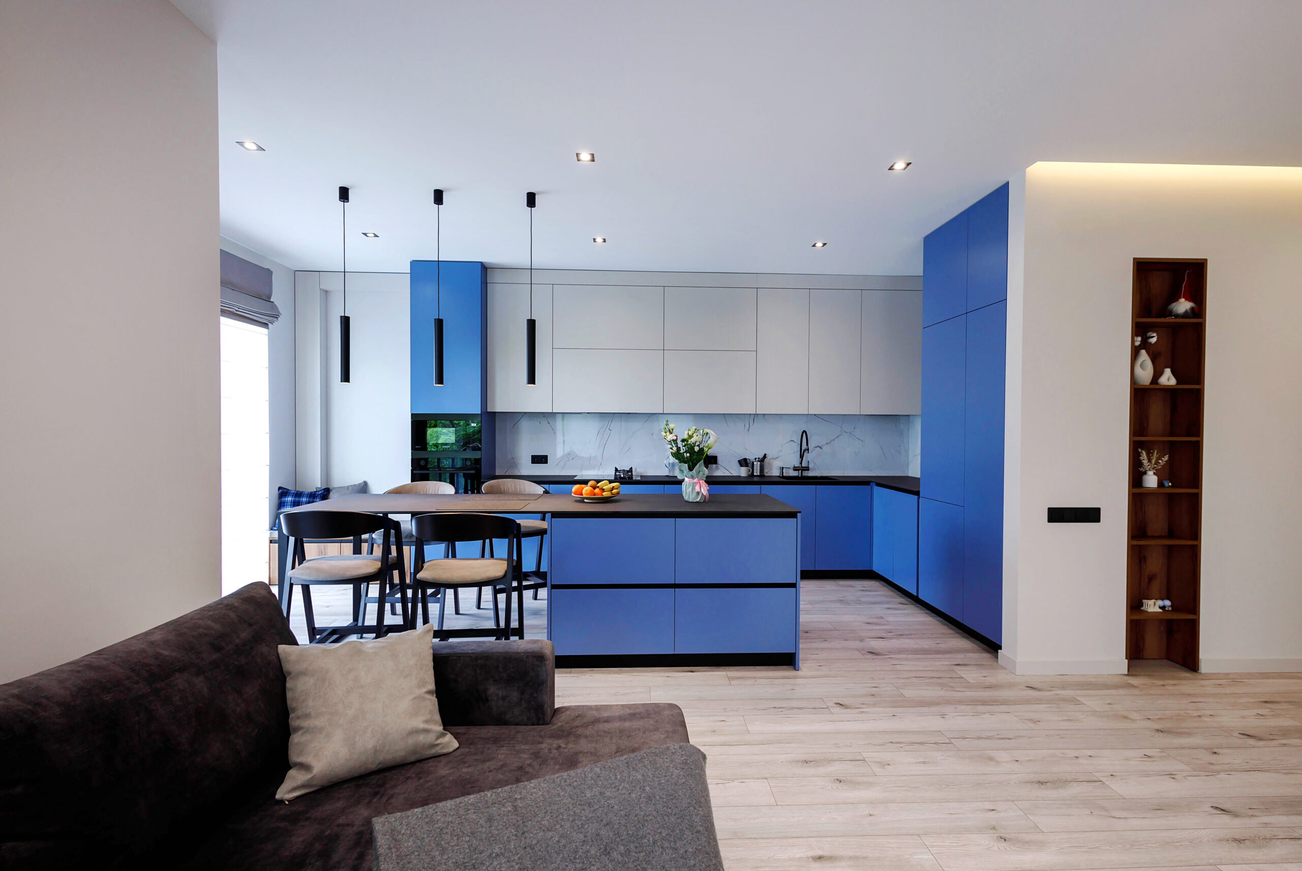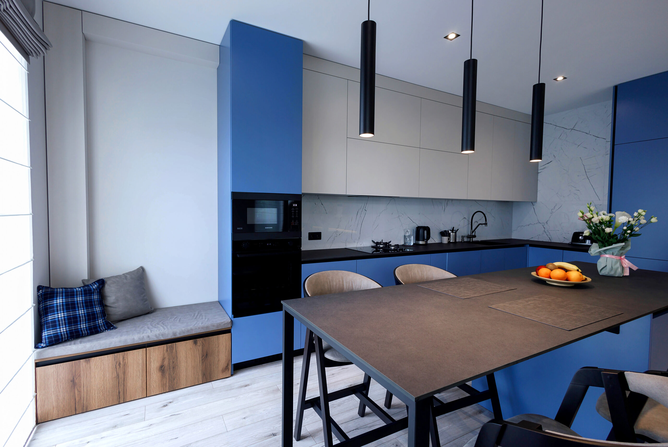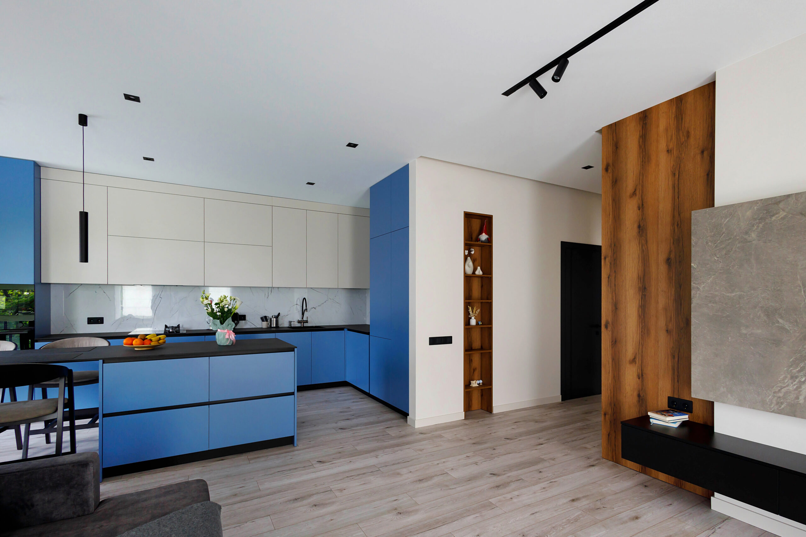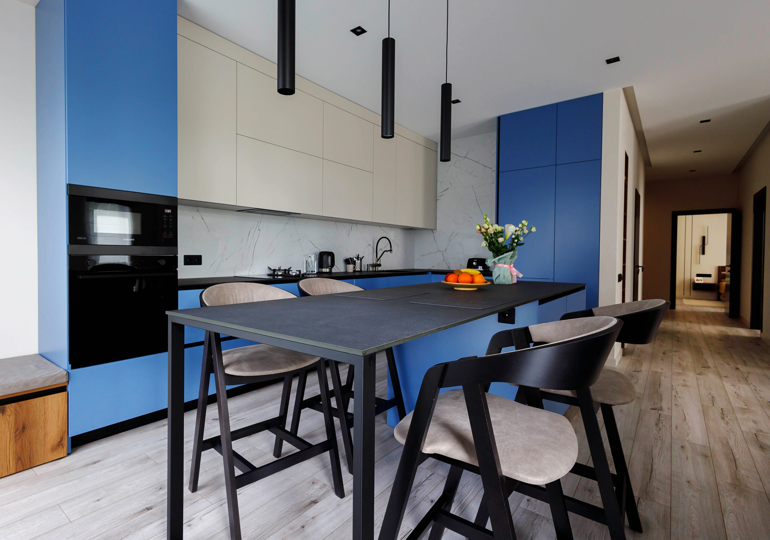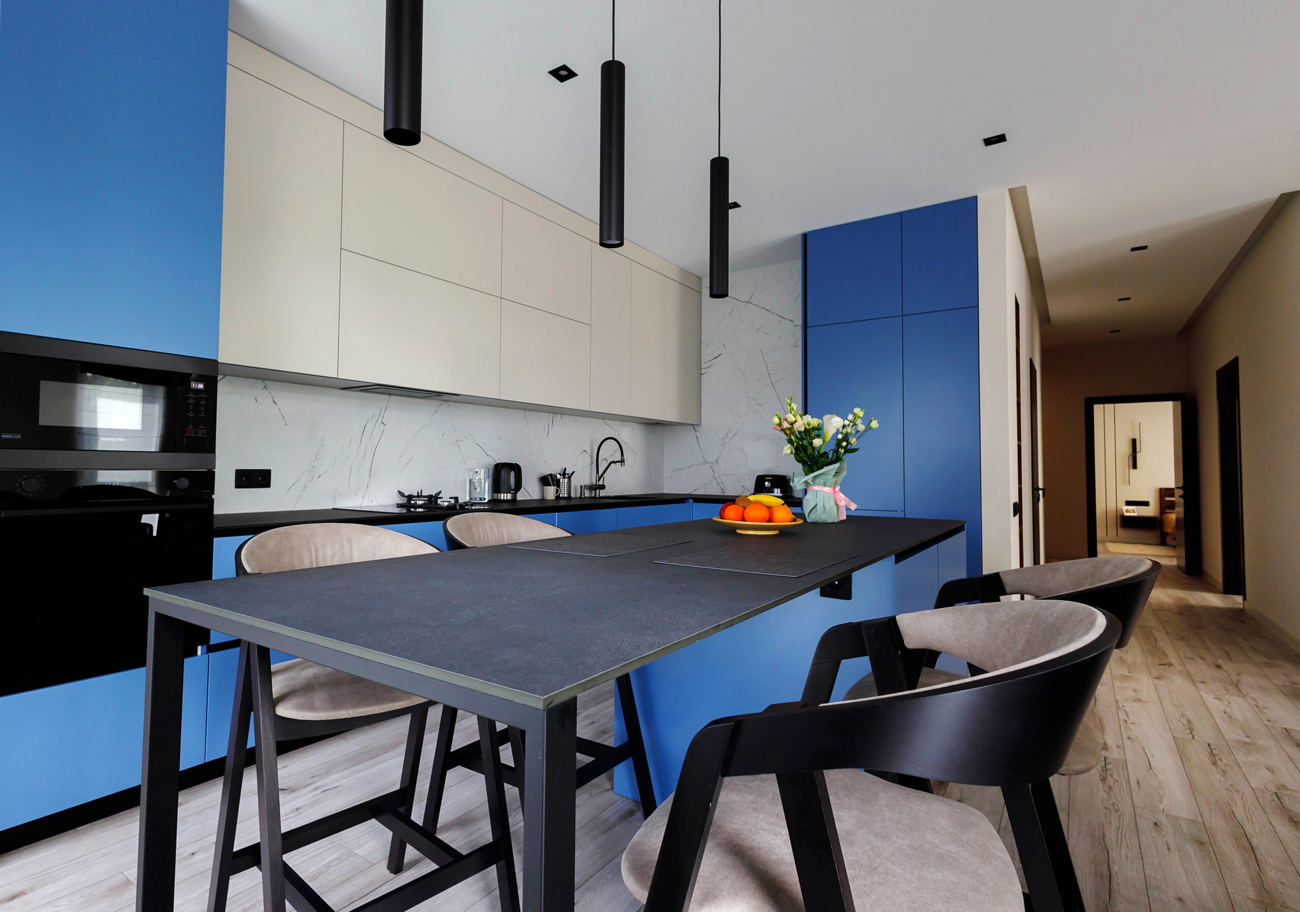 Кухня виконана в темно-синьому кольорі з матовими фасадами та інтегрованою технікою. Острів із стільницею слугує робочою зоною та місцем для сніданків, а обідня зона з дизайнерським освітленням створює камерну атмосферу.