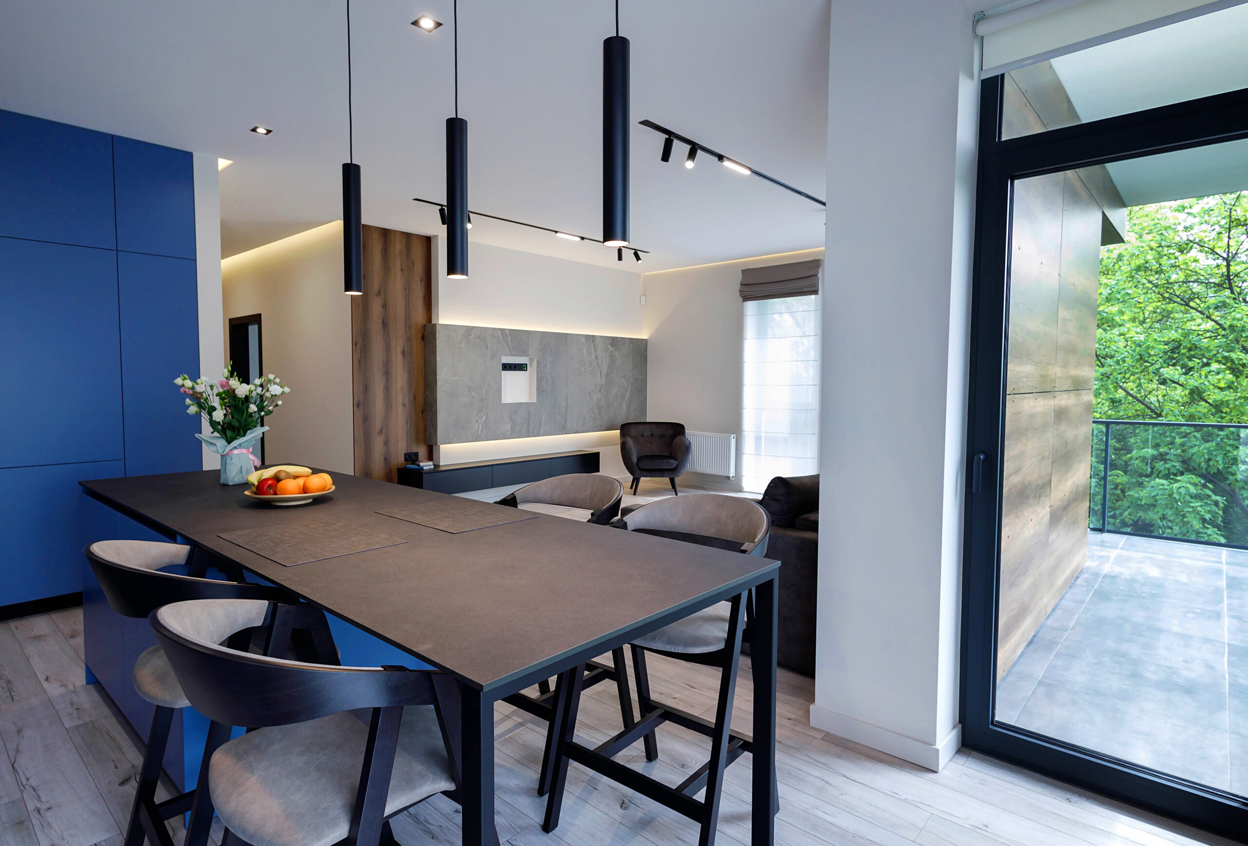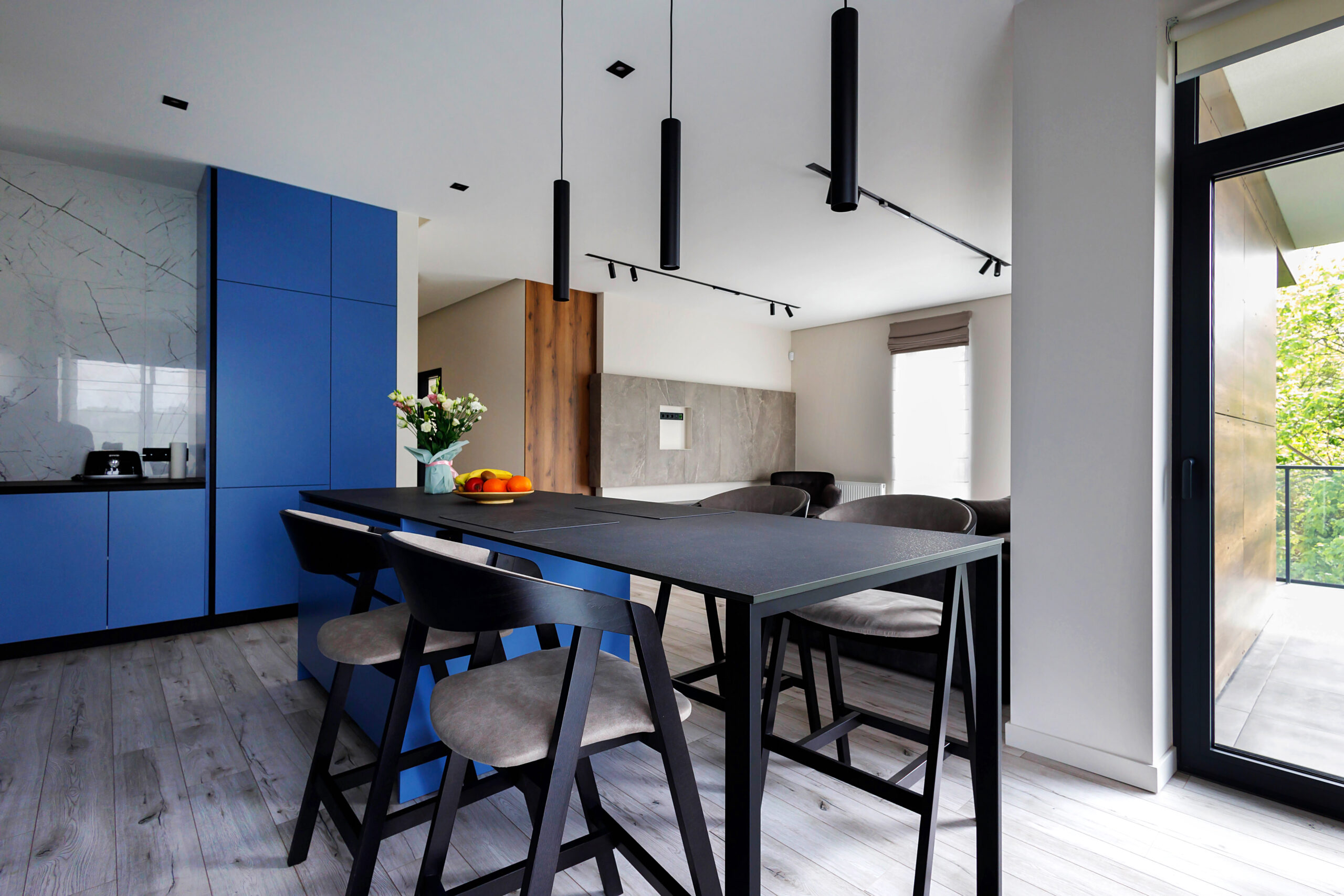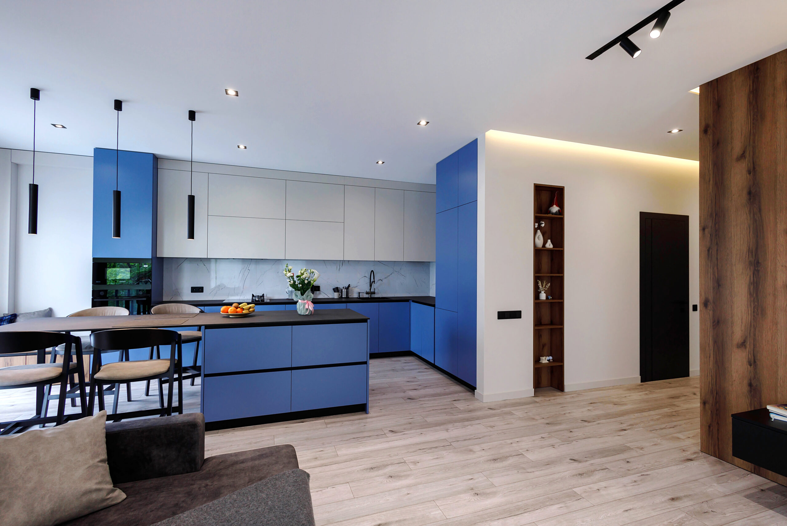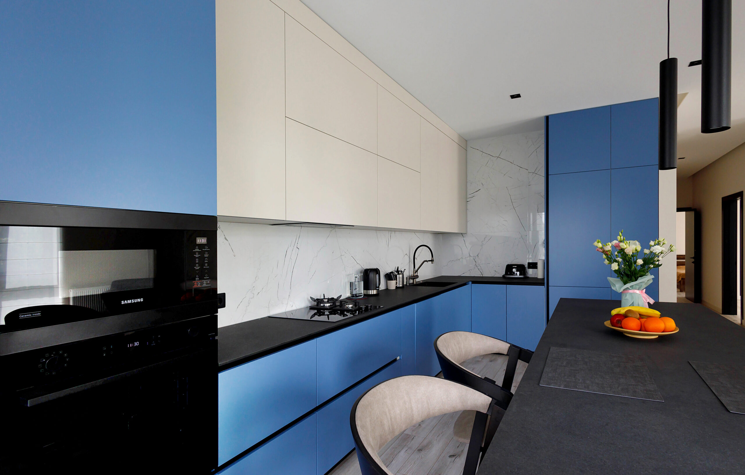Кухня виконана в темно-синьому кольорі з матовими фасадами та інтегрованою технікою. Острів із стільницею слугує робочою зоною та місцем для сніданків, а обідня зона з дизайнерським освітленням створює камерну атмосферу.