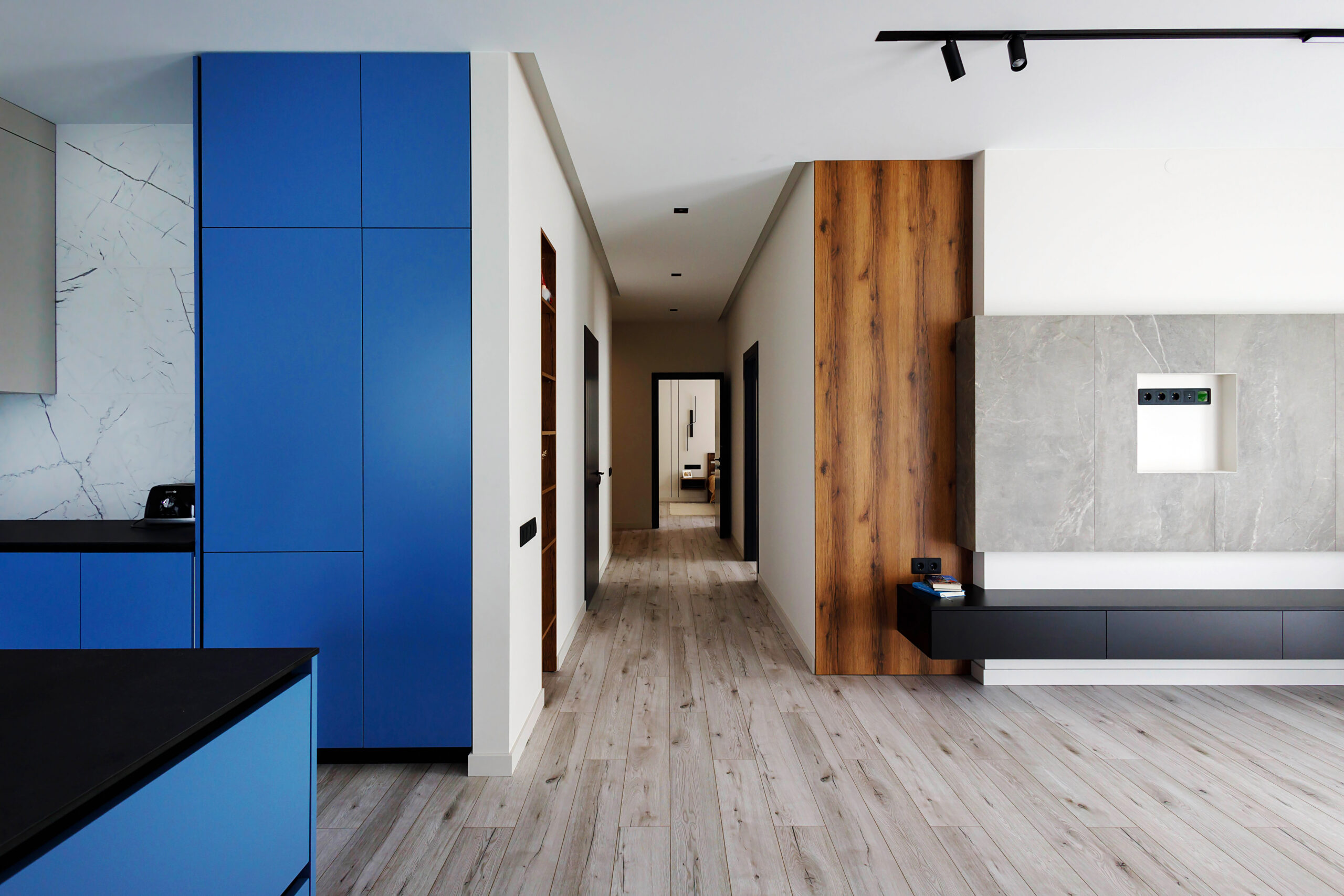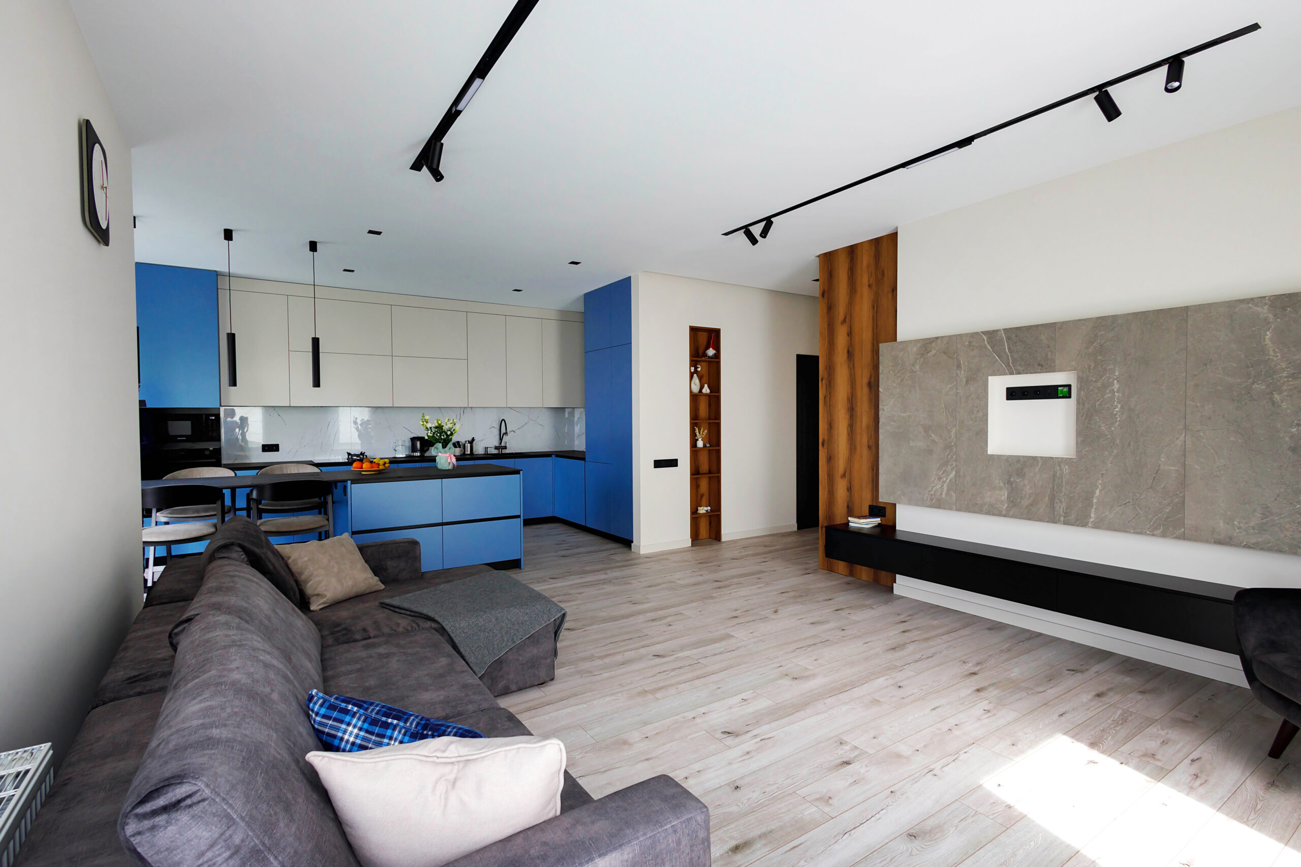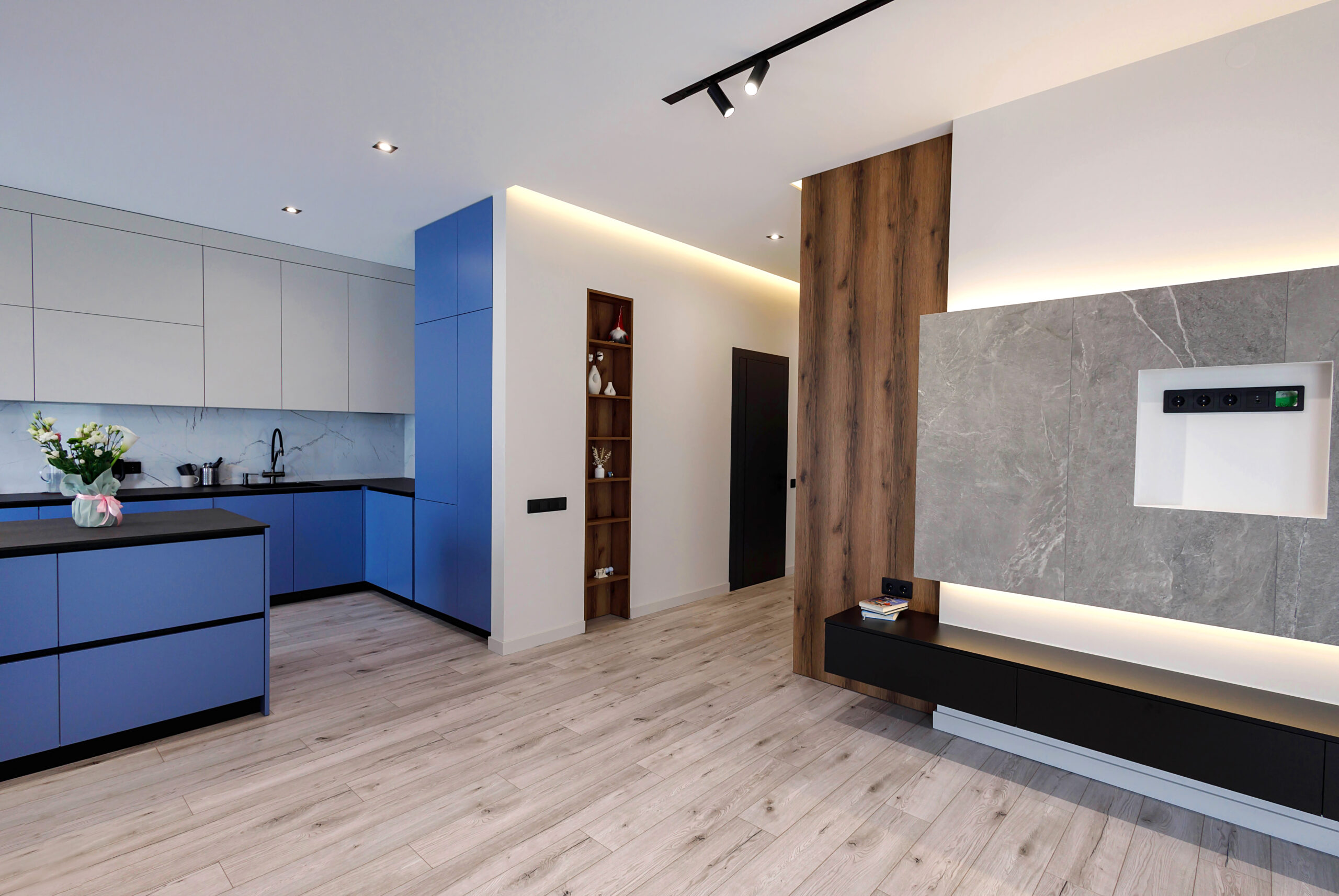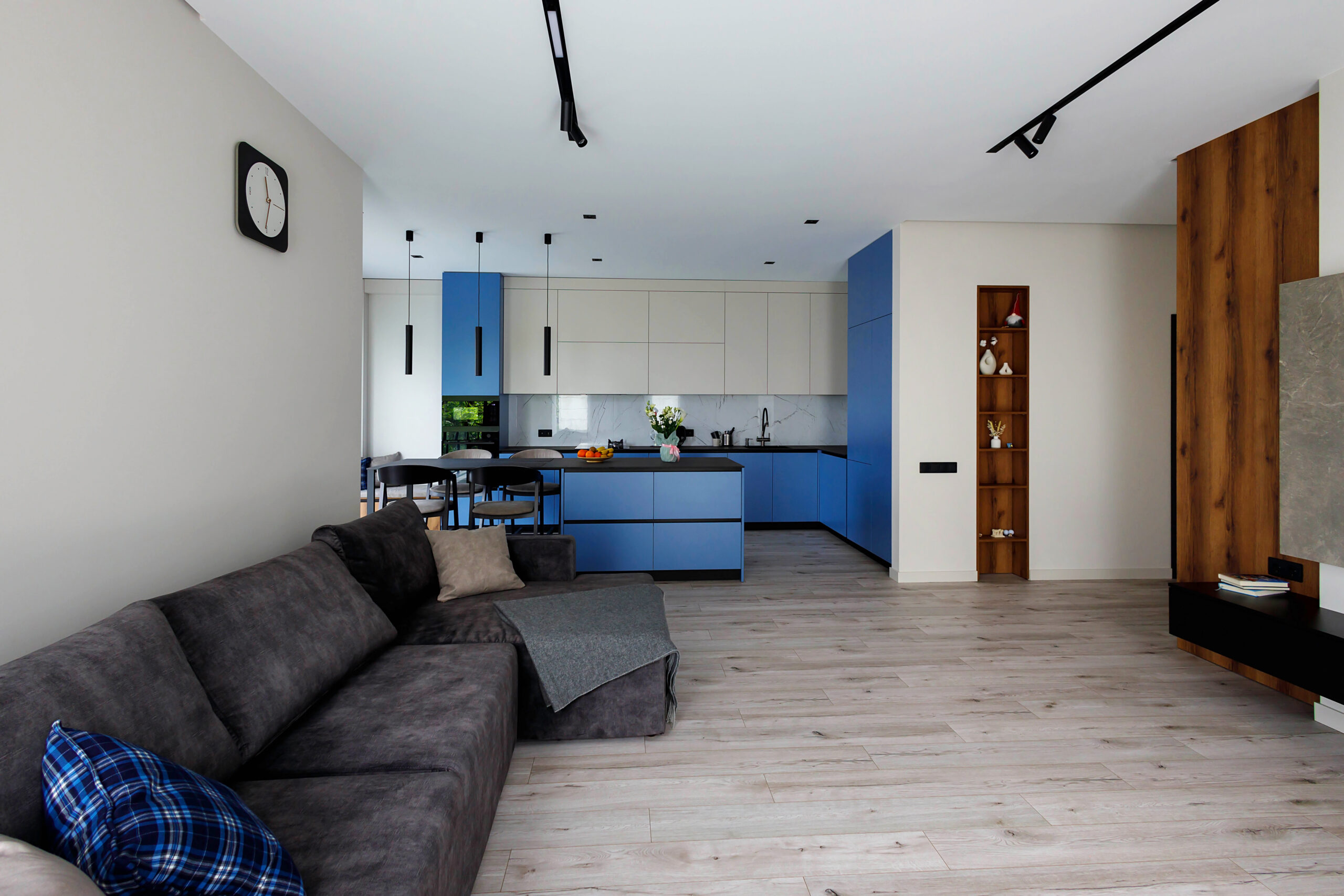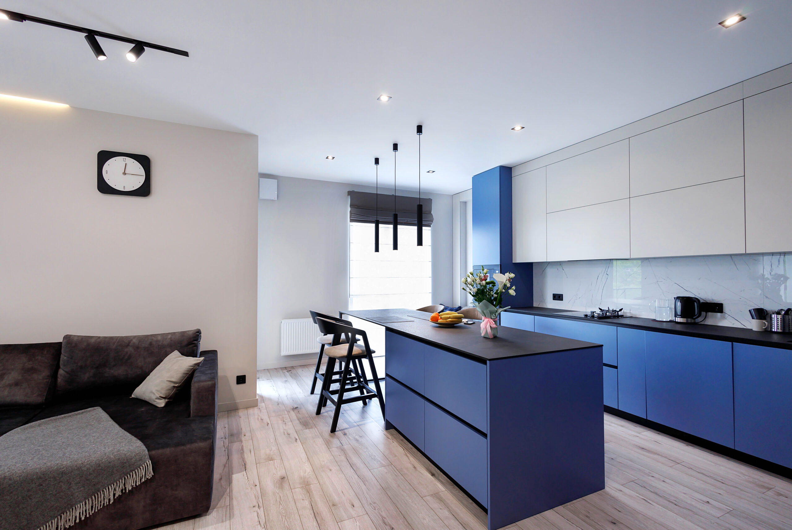 Кухня виконана в темно-синьому кольорі з матовими фасадами та інтегрованою технікою. Острів із стільницею слугує робочою зоною та місцем для сніданків, а обідня зона з дизайнерським освітленням створює камерну атмосферу.