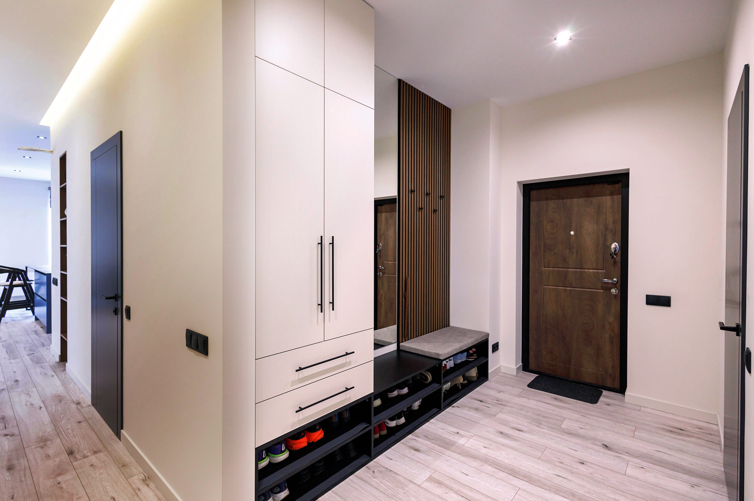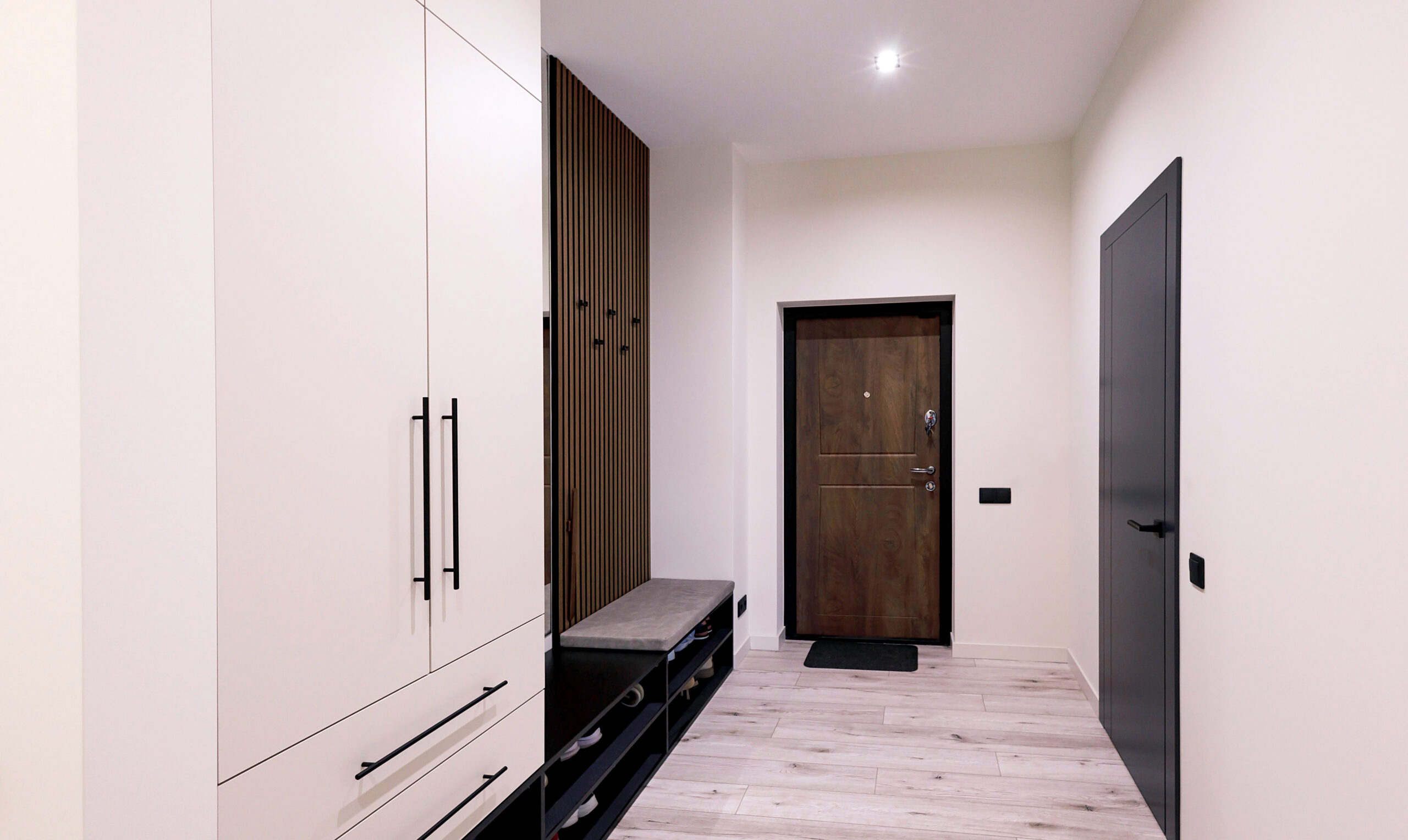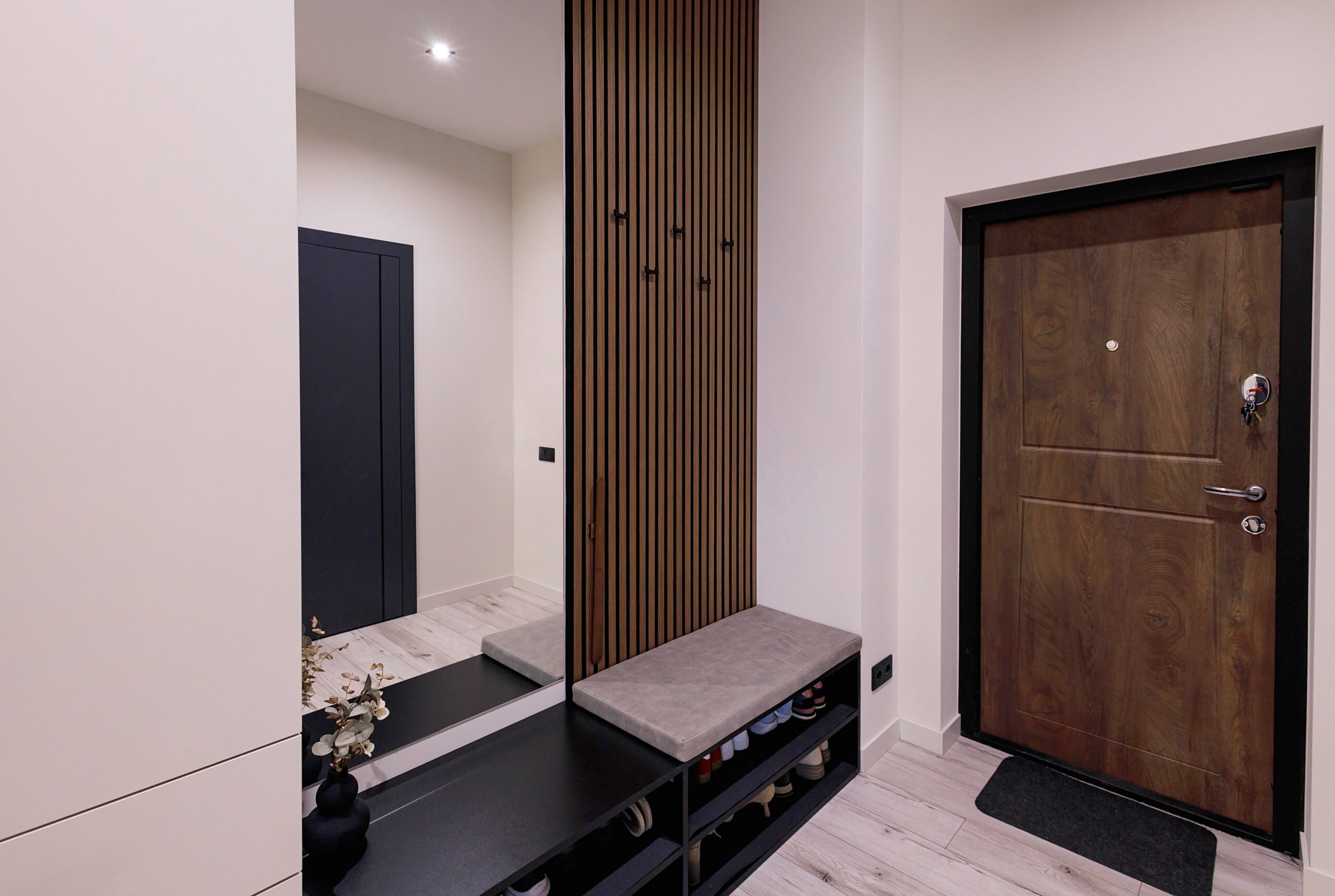 Передпокій оформлено світлими тонами з акцентною темною стіною та вбудованими нішами з м’яким підсвічуванням. Дерев’яні елементи та функціональна система зберігання роблять зону входу практичною та естетичною.