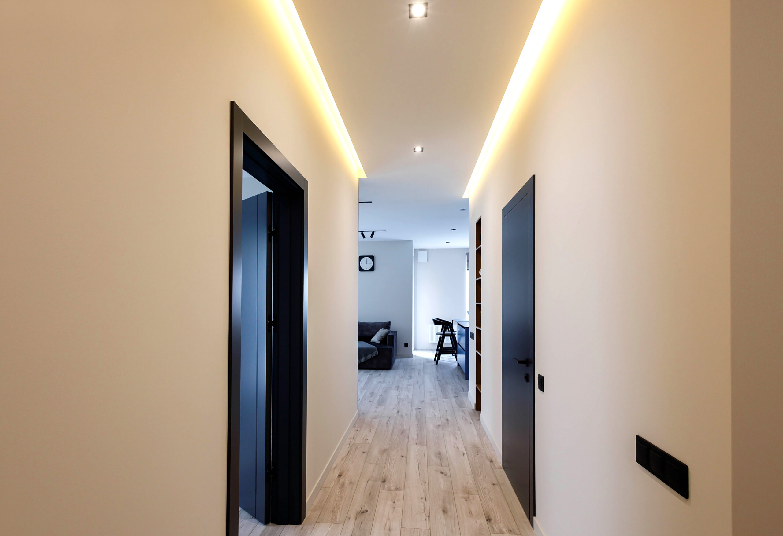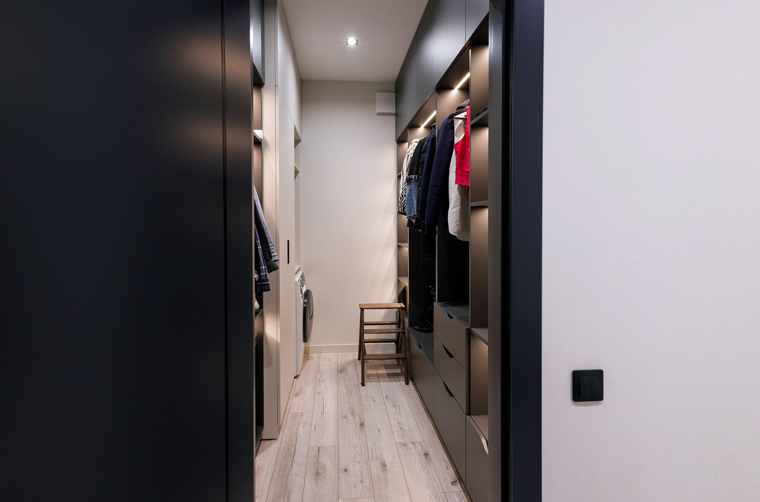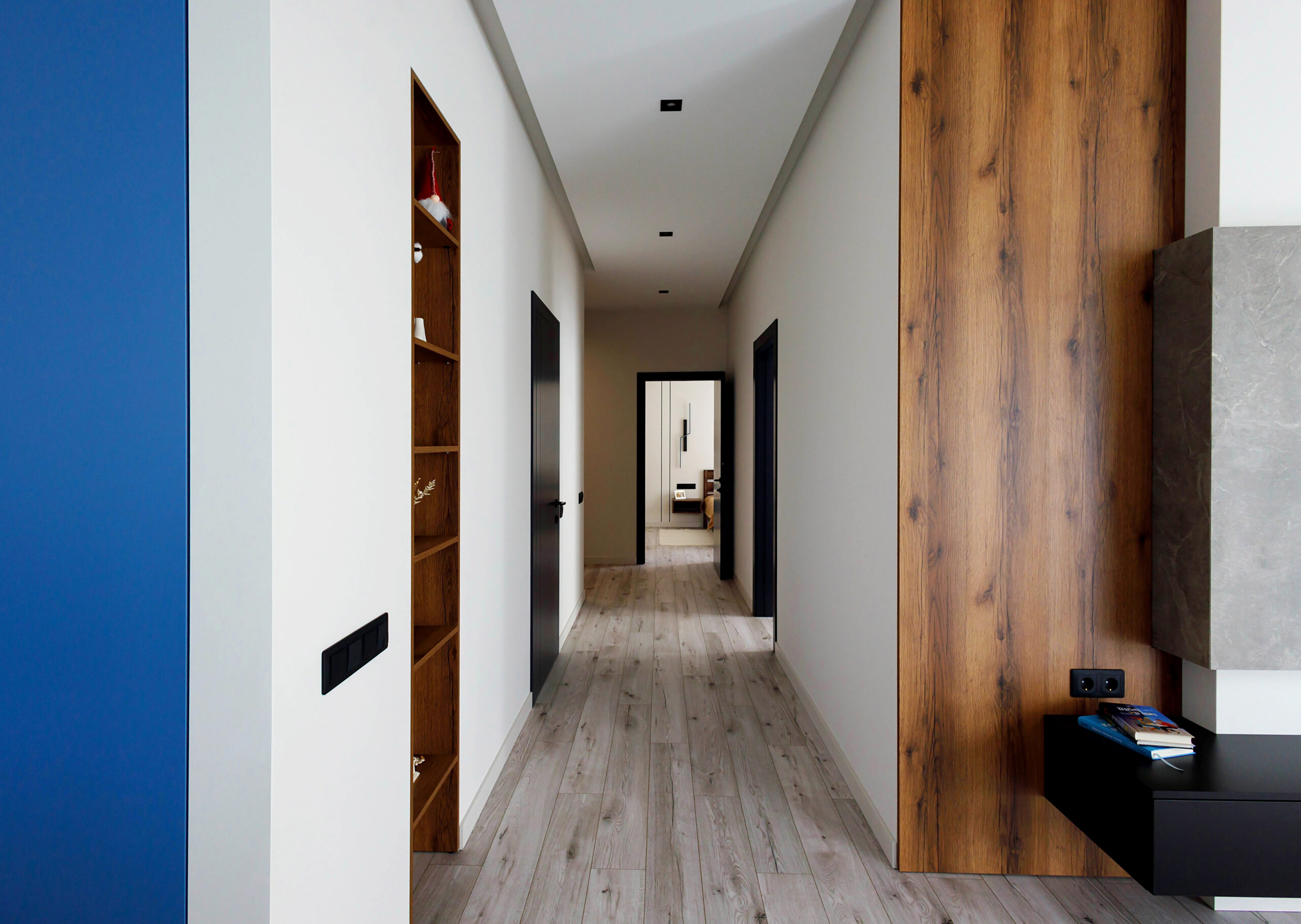 Передпокій оформлено світлими тонами з акцентною темною стіною та вбудованими нішами з м’яким підсвічуванням. Дерев’яні елементи та функціональна система зберігання роблять зону входу практичною та естетичною.