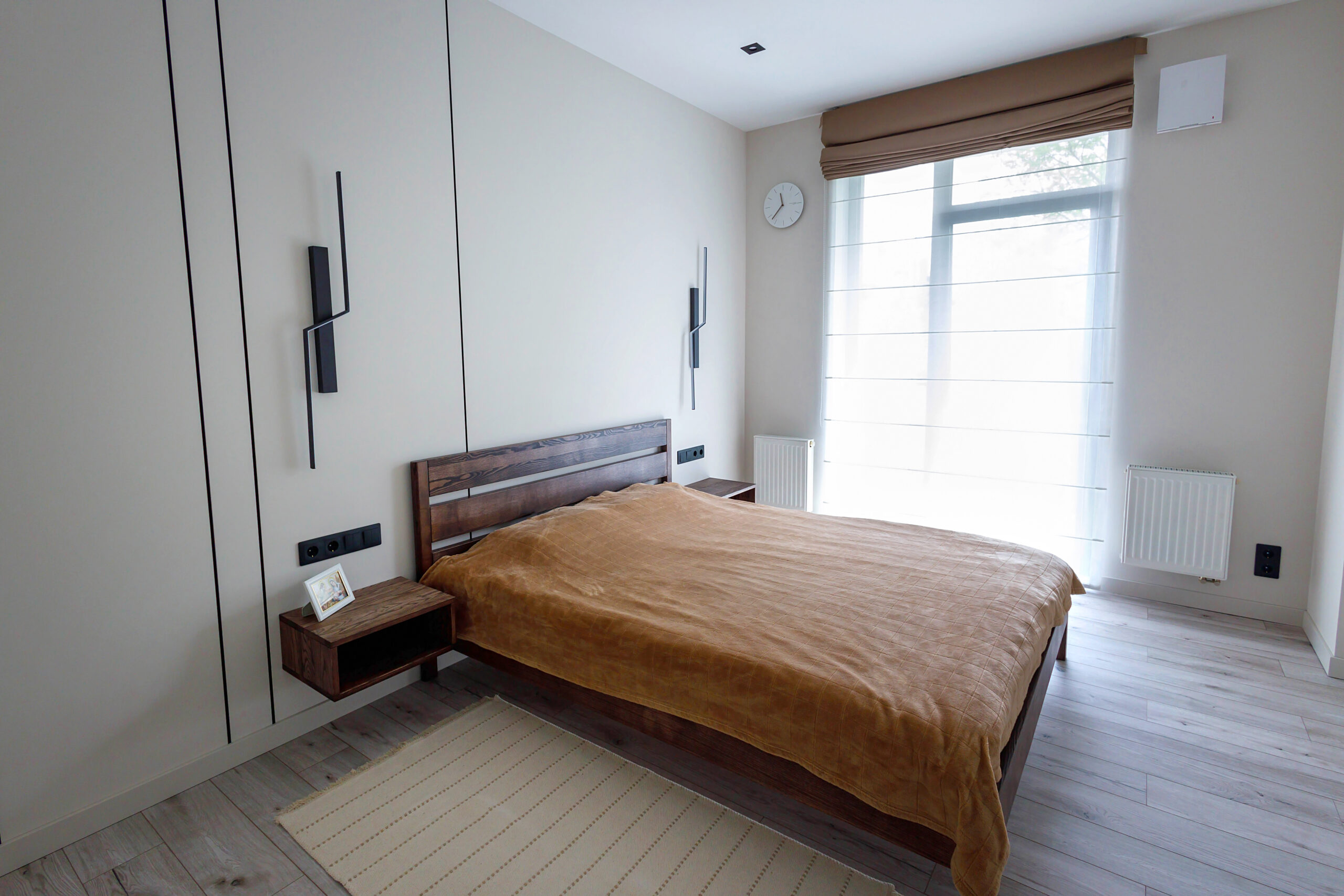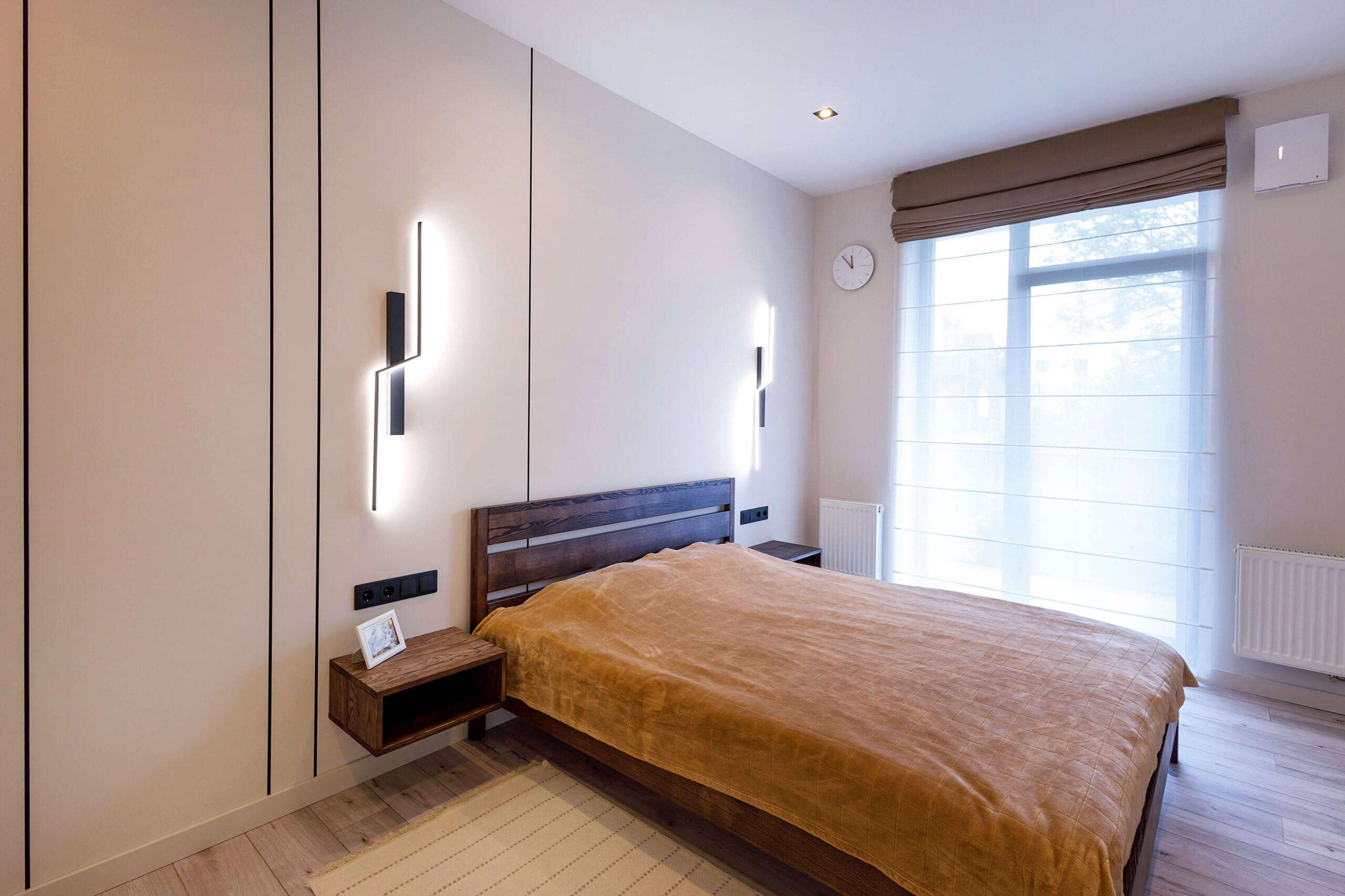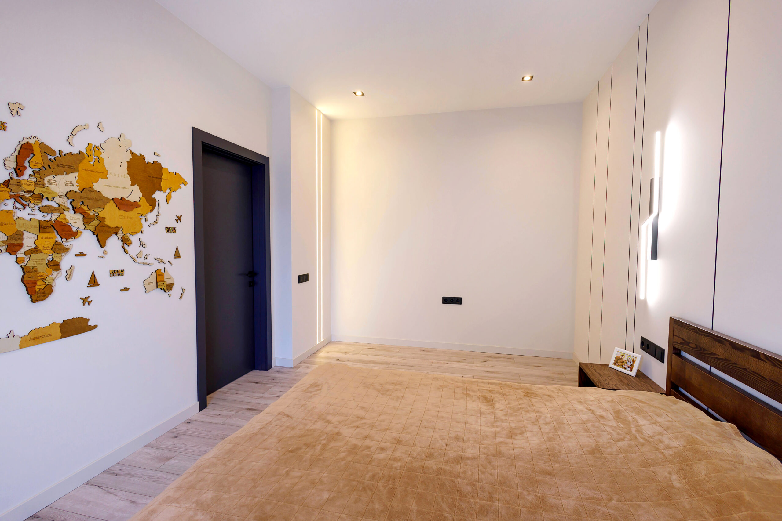 Спальня втілює спокій завдяки м’якій панелі за узголів’ям та теплому освітленню. Акцентна стіна з декоративними дерев’яними планками додає текстурності, а вбудовані шафи забезпечують простір для зберігання.