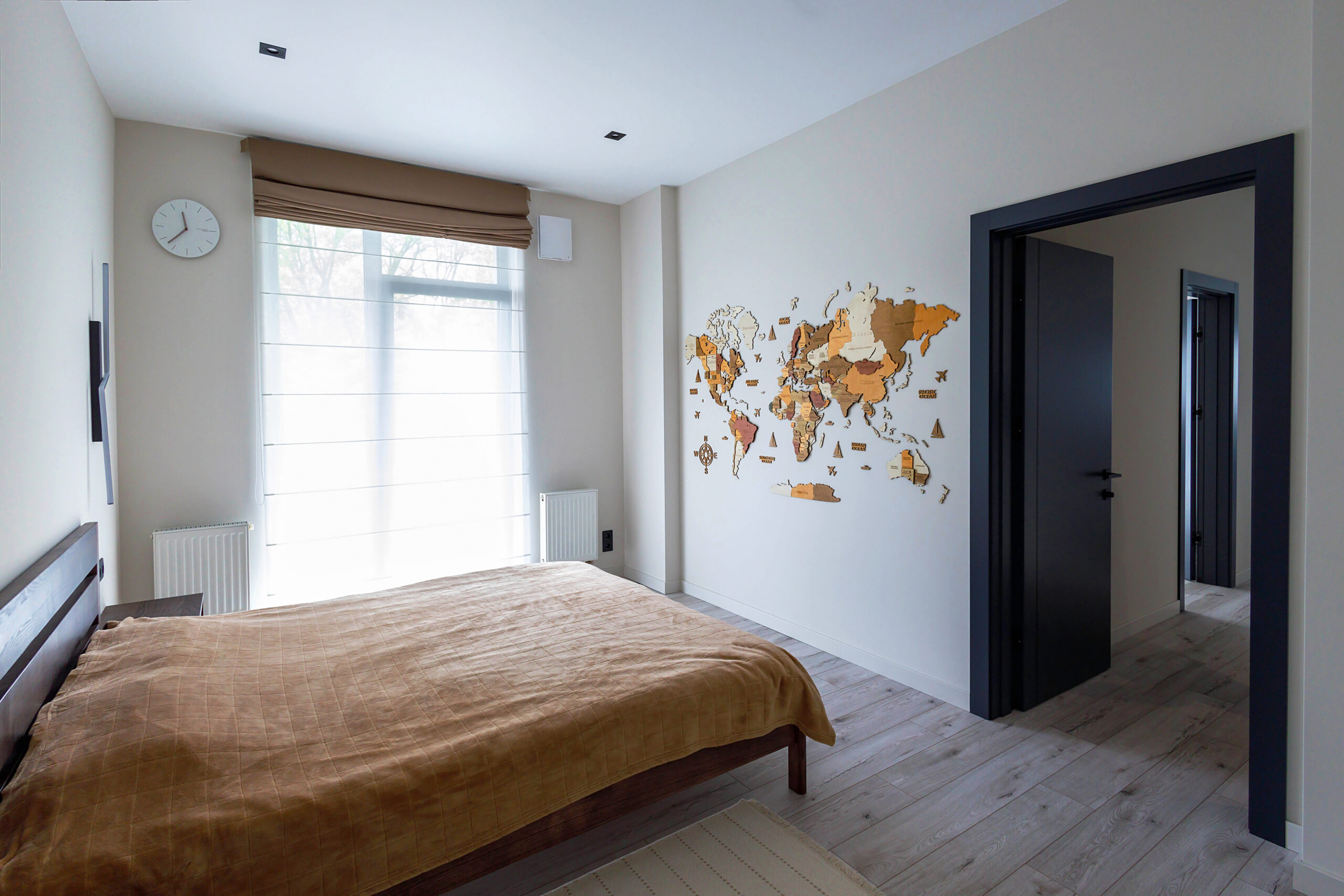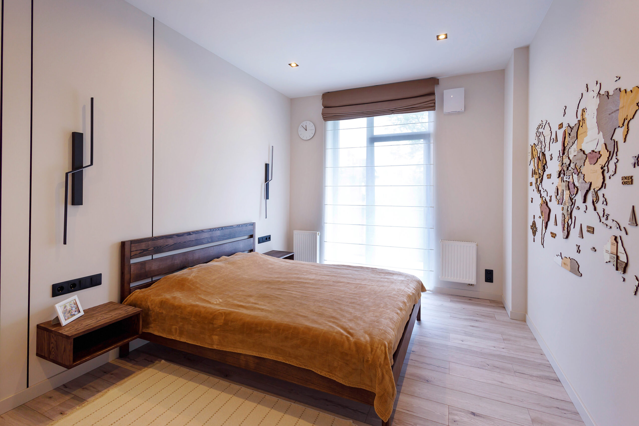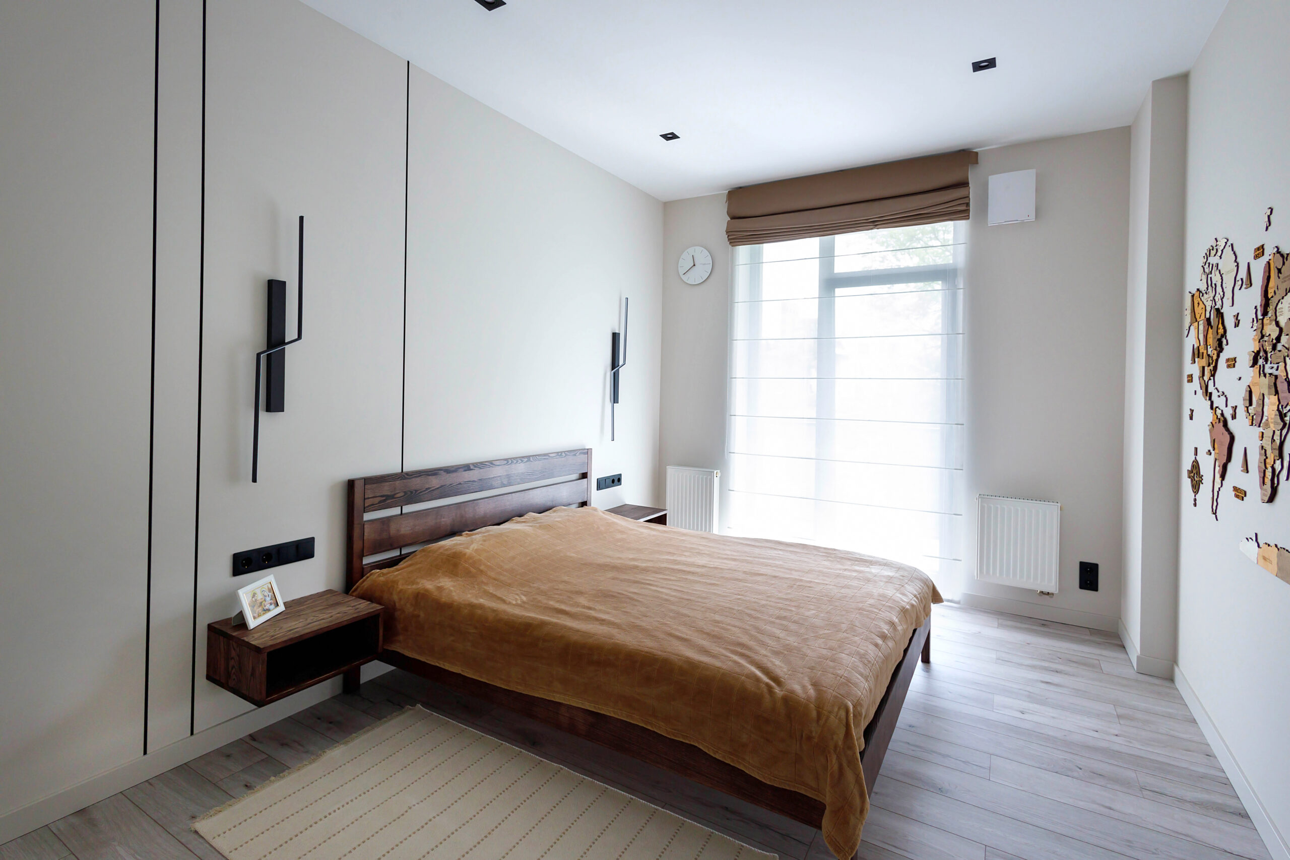 Спальня втілює спокій завдяки м’якій панелі за узголів’ям та теплому освітленню. Акцентна стіна з декоративними дерев’яними планками додає текстурності, а вбудовані шафи забезпечують простір для зберігання.