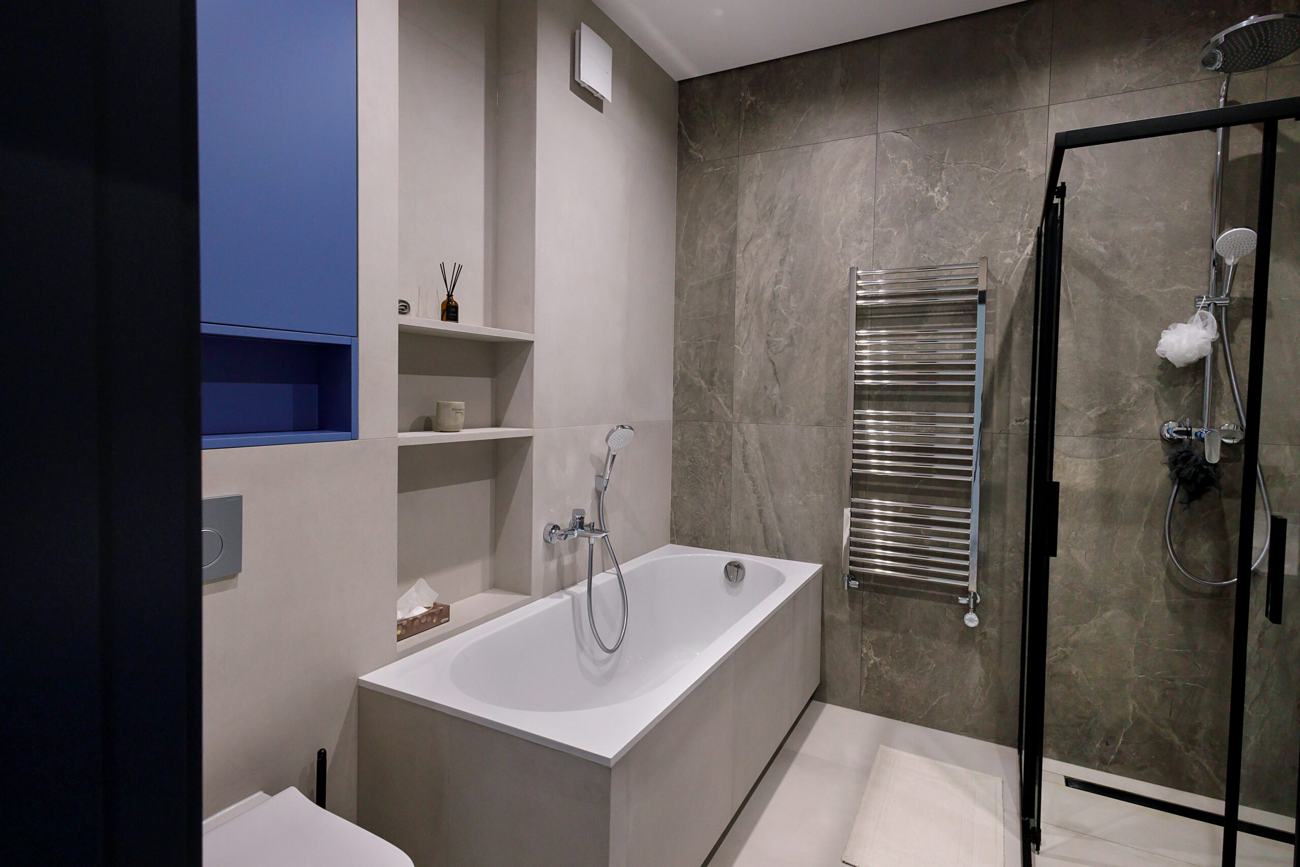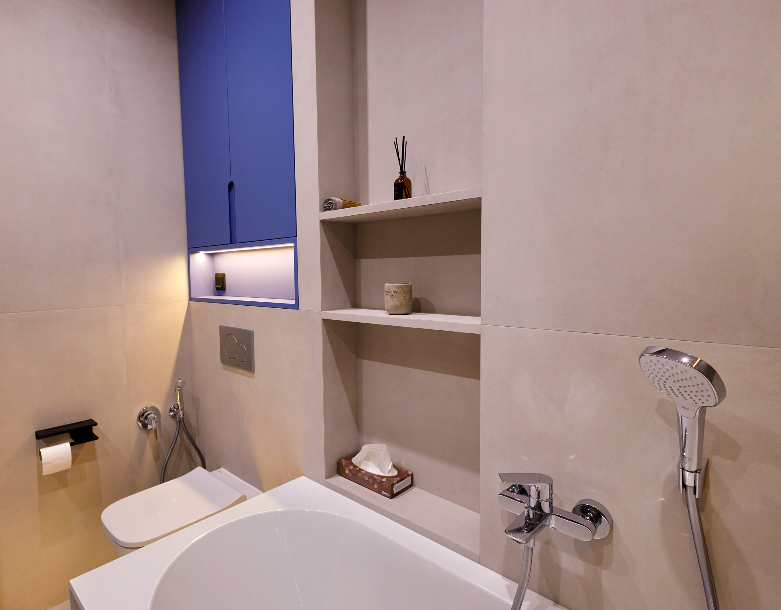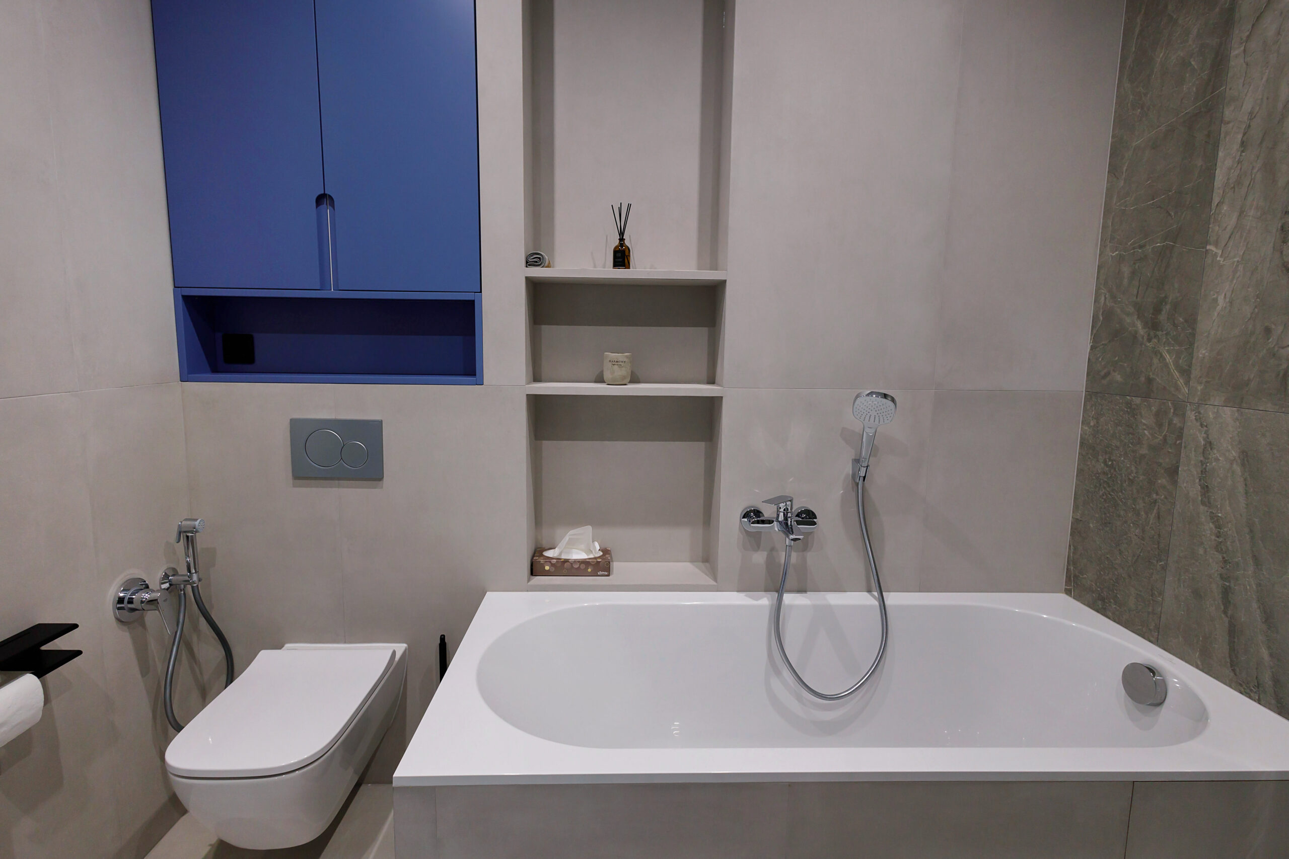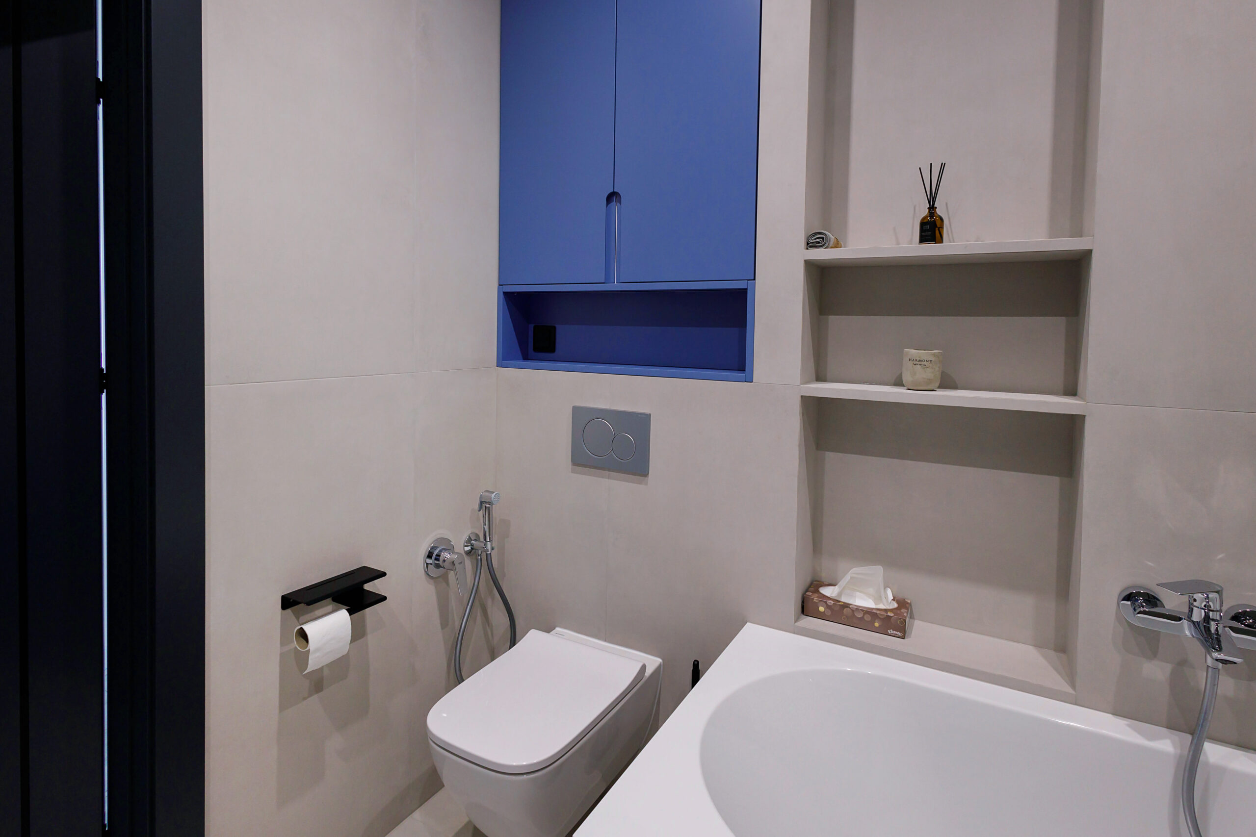 Ванна кімната оформлена великоформатною керамікою в світлих тонах із контрастними вставками. Сучасна сантехніка преміум-класу, скляні перегородки та підвісні меблі створюють відчуття простору. Санвузол продовжує стилістику з ідентичними матеріалами.