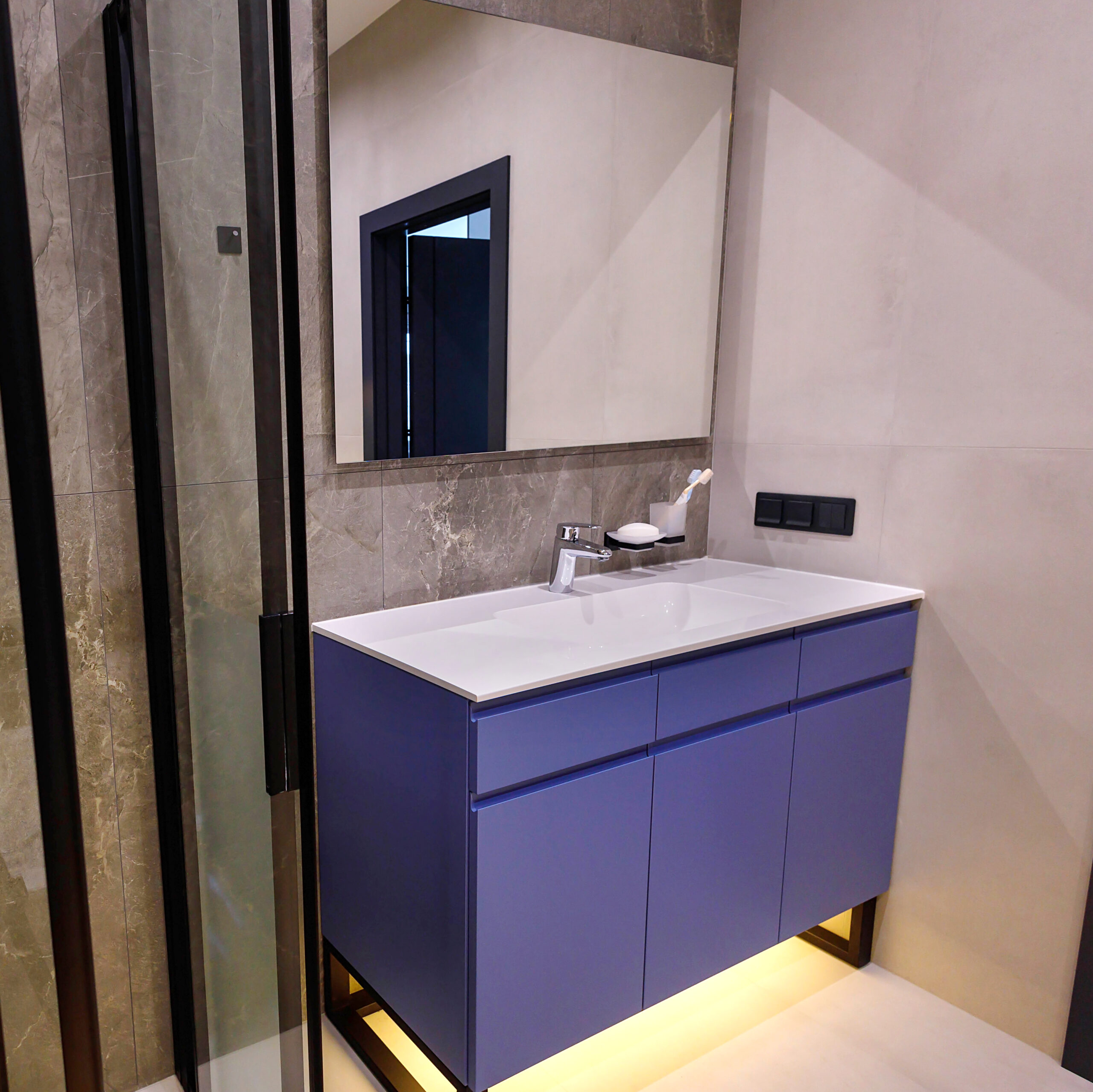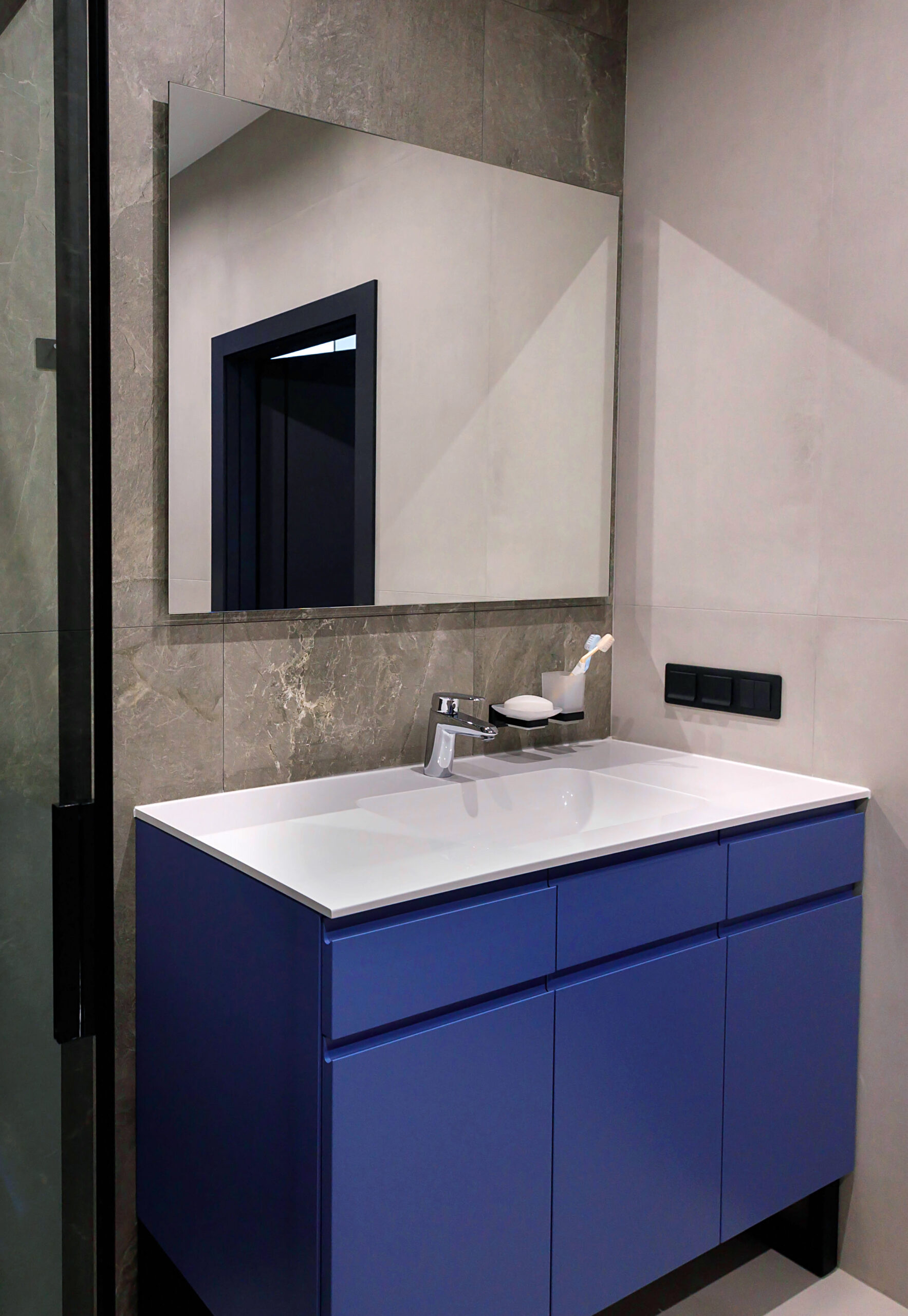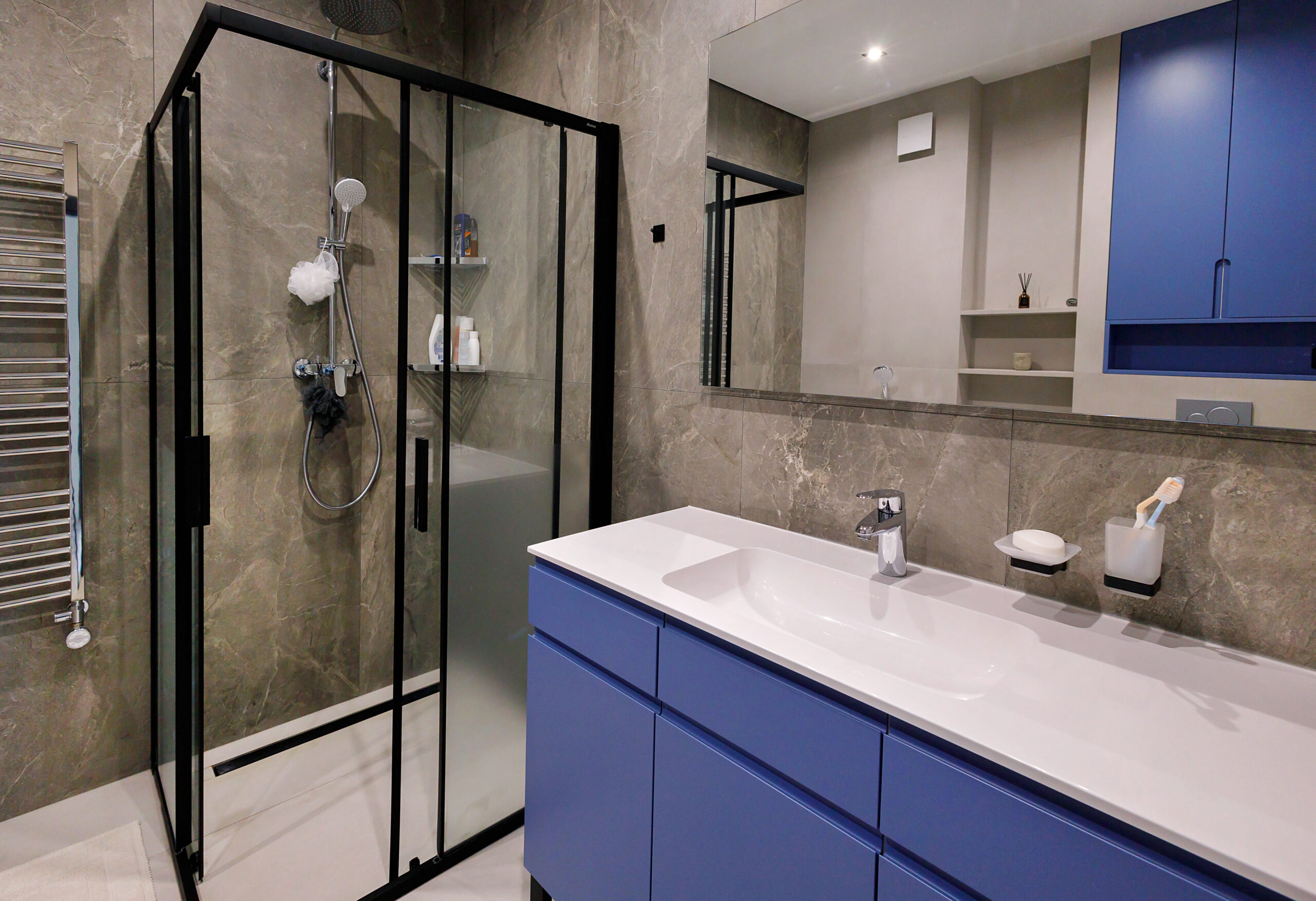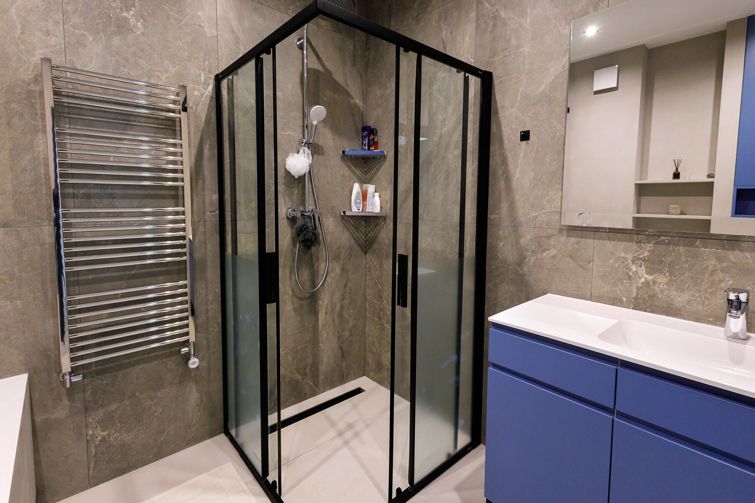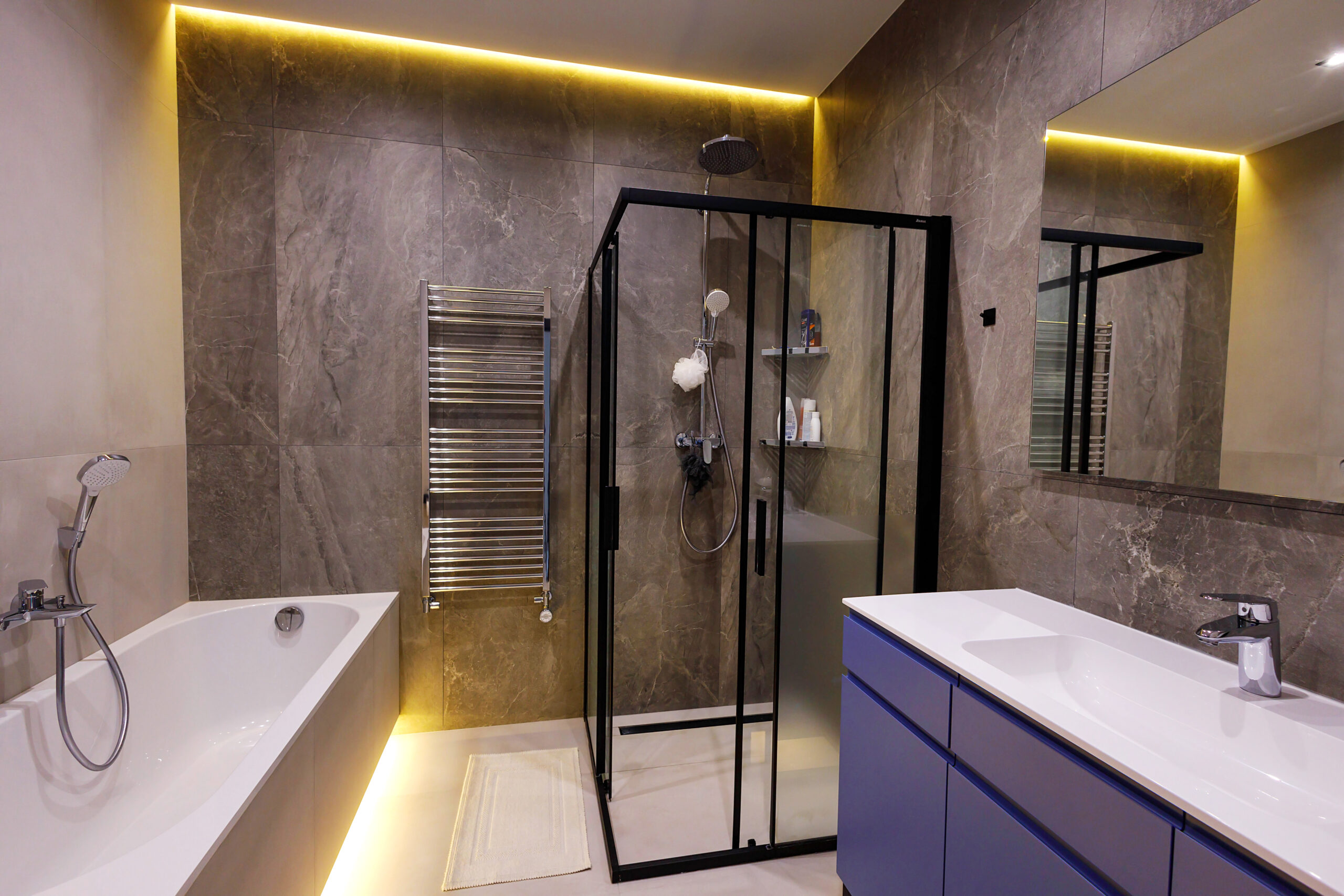 Ванна кімната оформлена великоформатною керамікою в світлих тонах із контрастними вставками. Сучасна сантехніка преміум-класу, скляні перегородки та підвісні меблі створюють відчуття простору. Санвузол продовжує стилістику з ідентичними матеріалами.